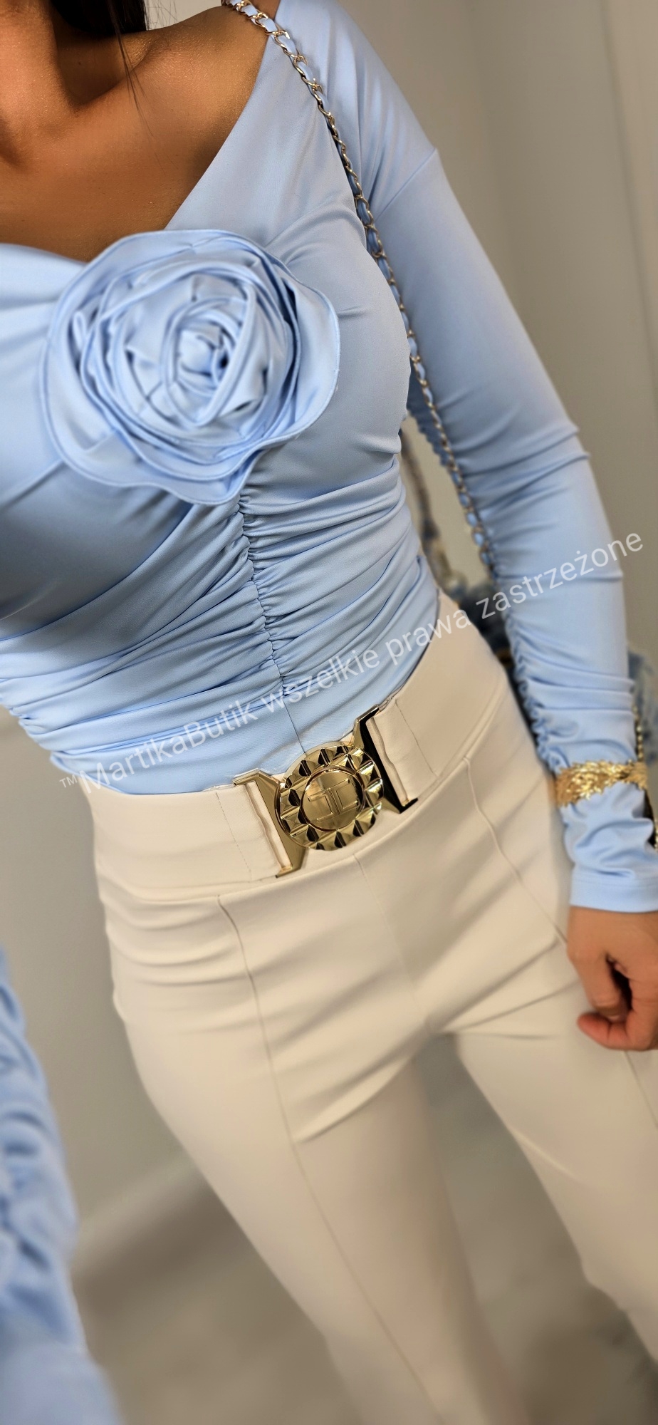Marszczenia na całej bluzce optycznie wyszczuplają sylwetkę.