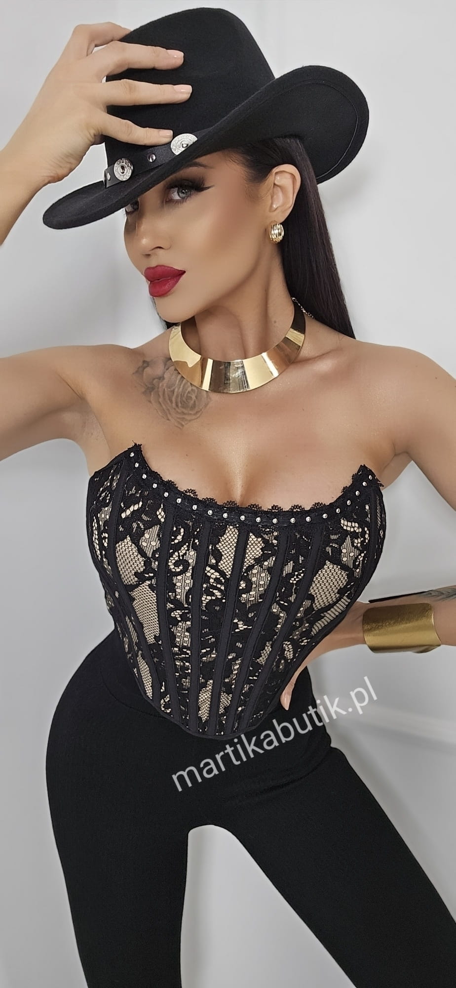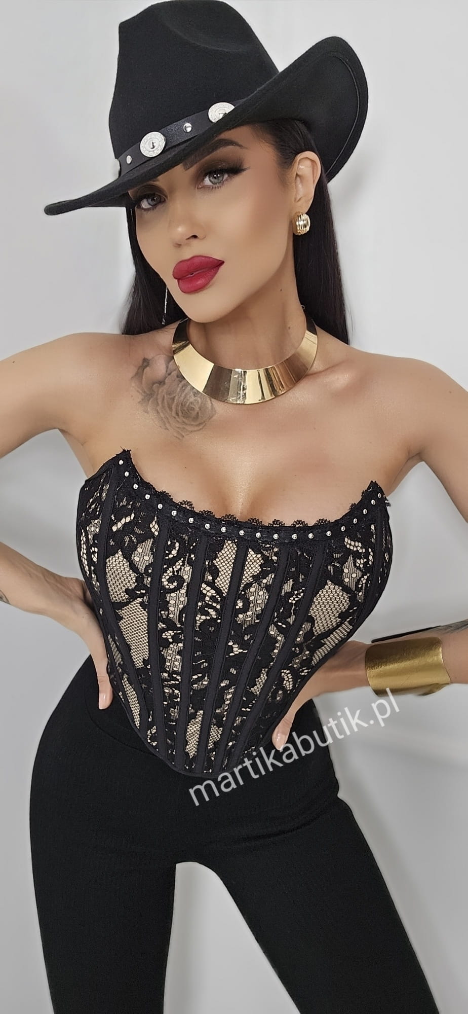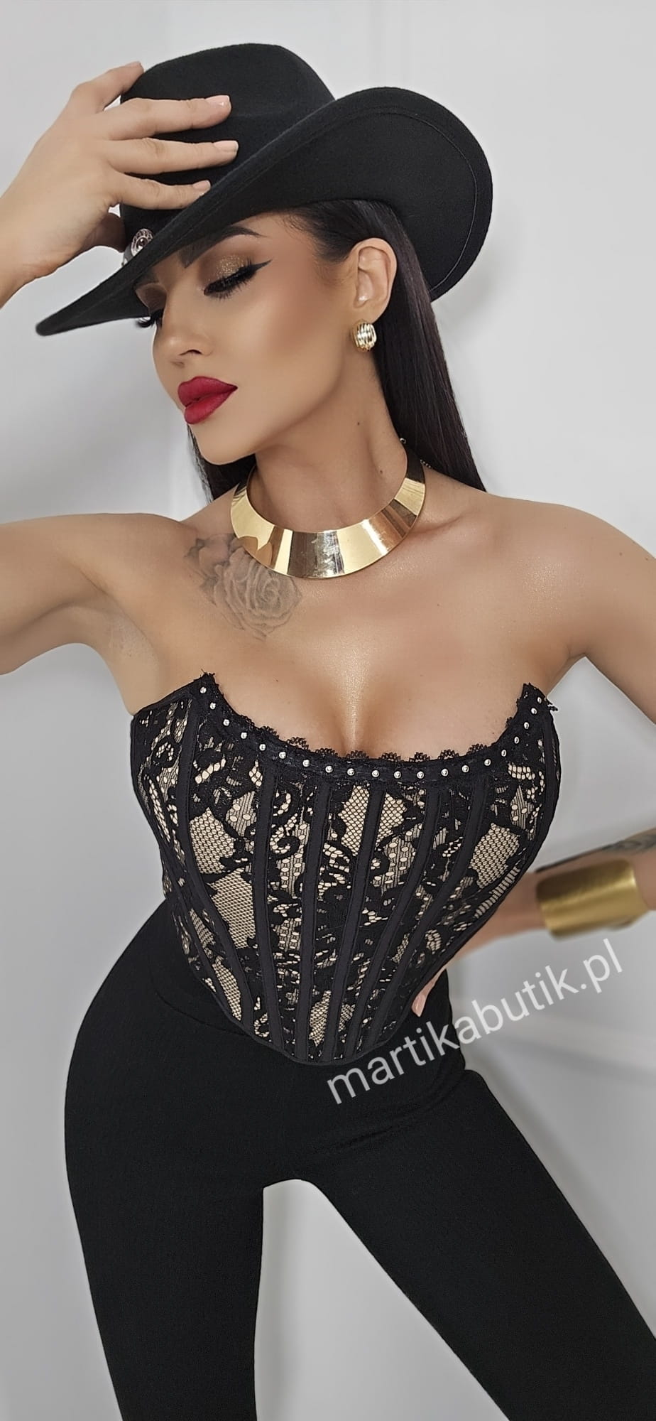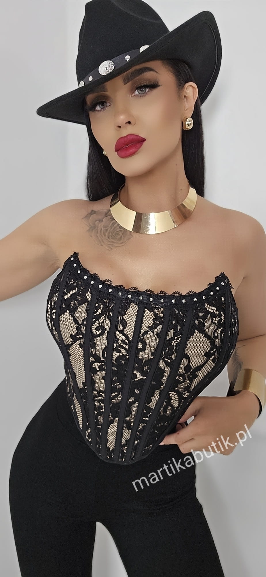 Elegancki gorset w stylu bieliźnianym, wykonany z koronki oraz cielistego podbicia.
