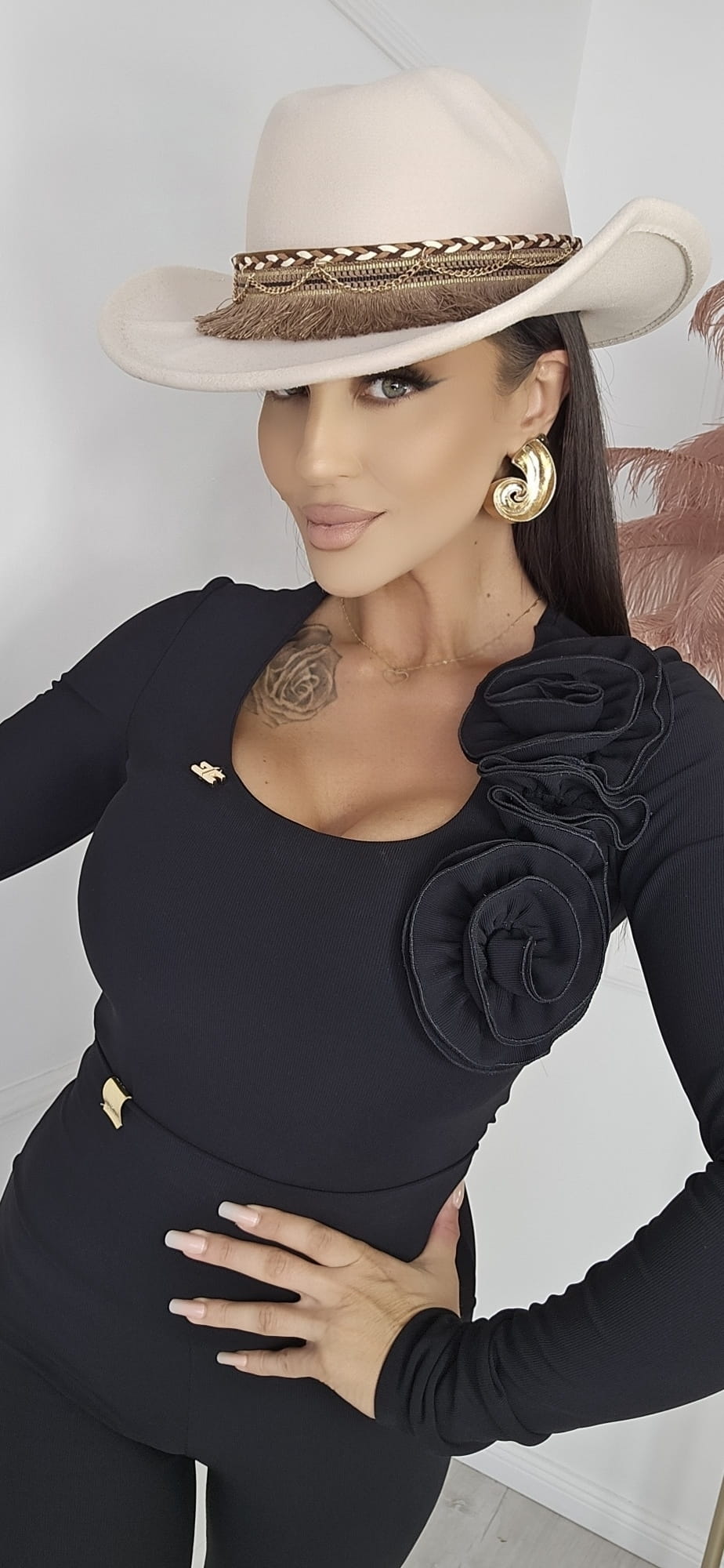 Średnie rondo rozmiar uniwersalny tasiemka ściągająca wewnątrz do zmniejszania obwodu. Kapelusz ozdobiony skórkowym paskiem z ozdobami.