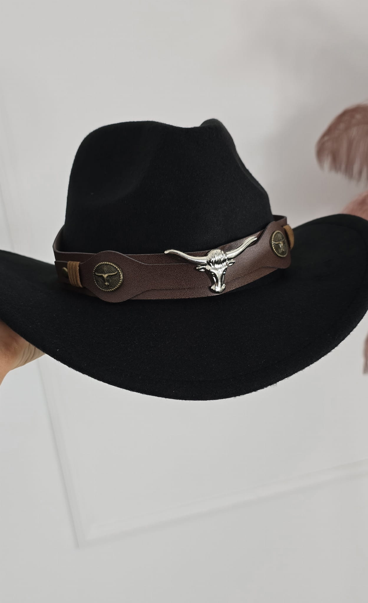 Średnie rondo rozmiar uniwersalny tasiemka ściągająca wewnątrz do zmniejszania obwodu. Kapelusz ozdobiony skórkowym paskiem z ozdobami.