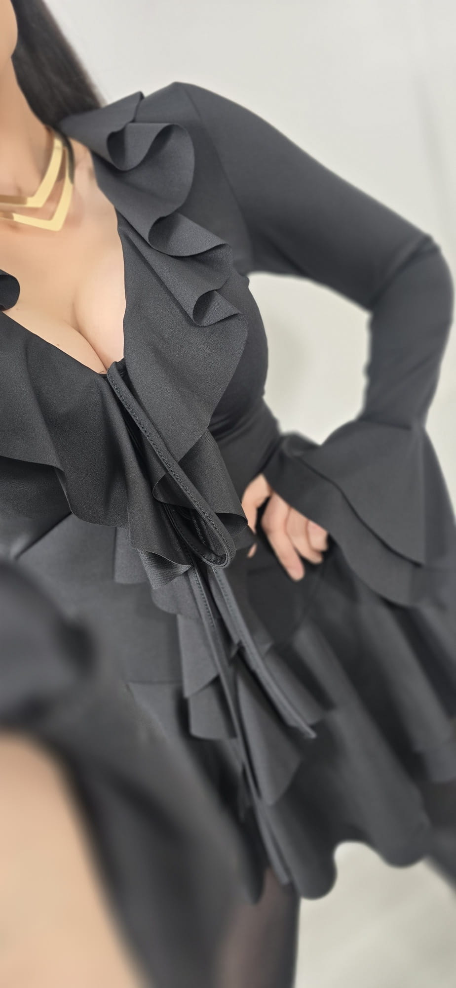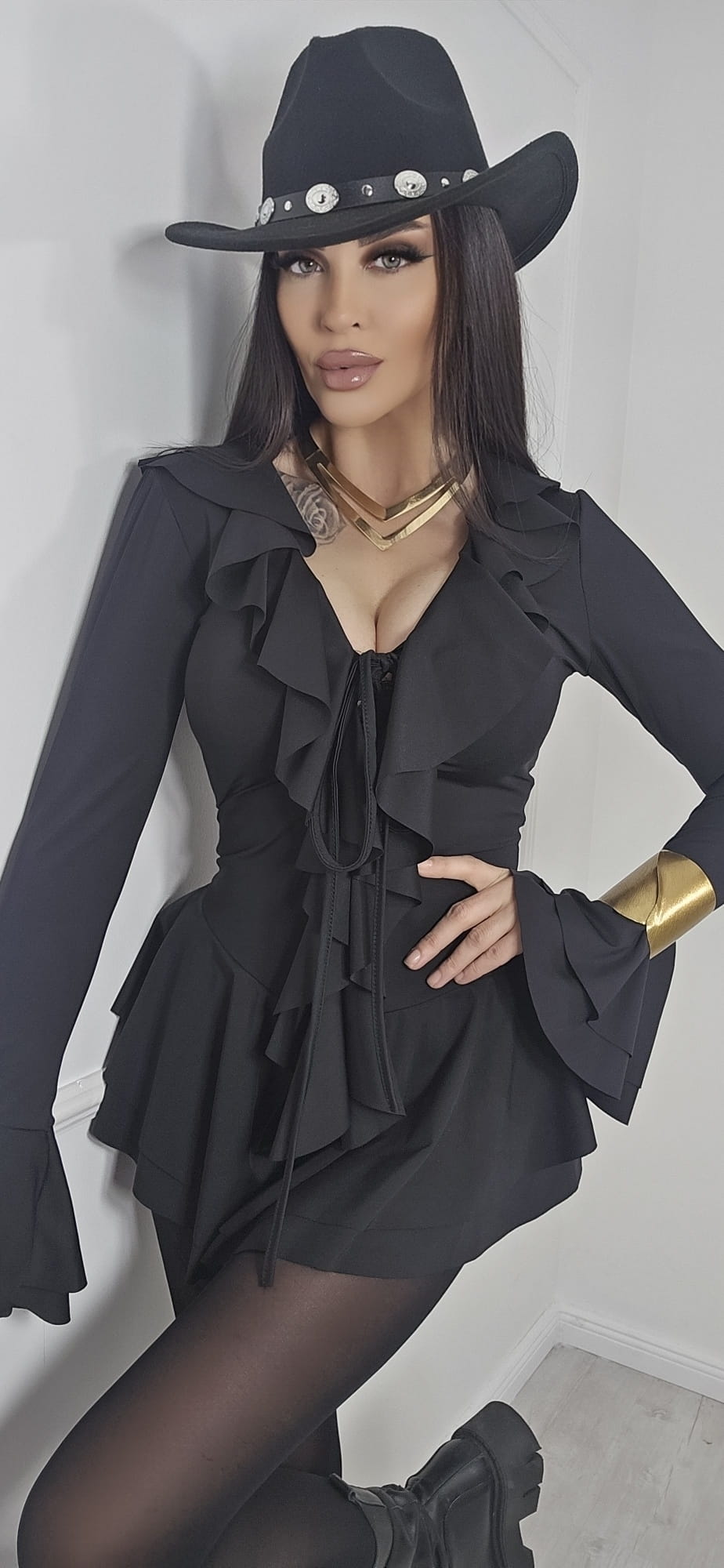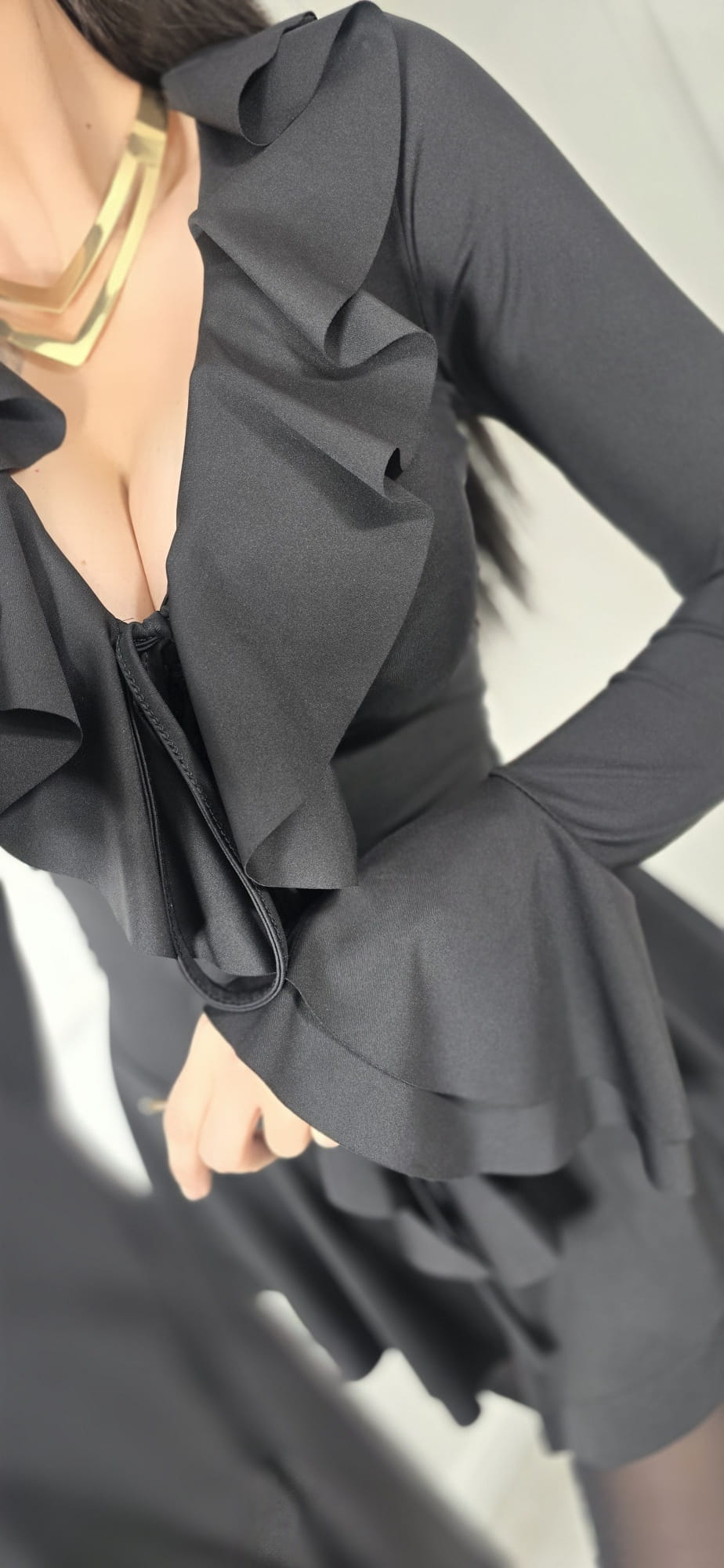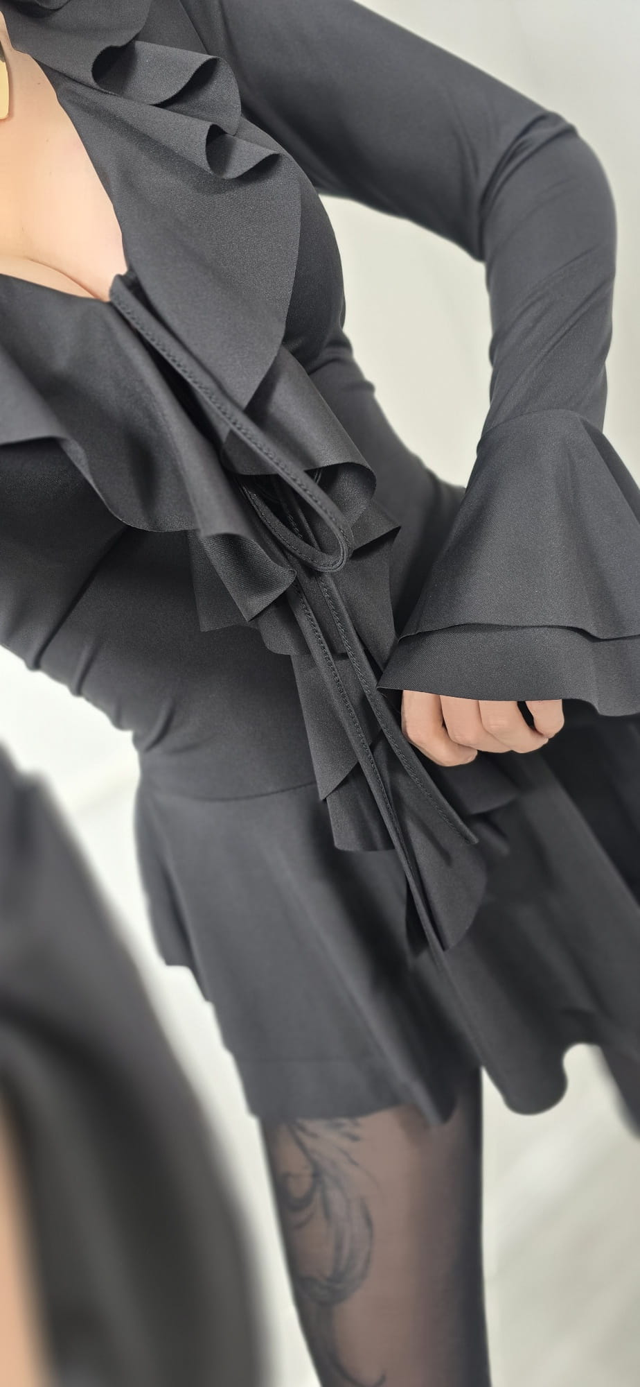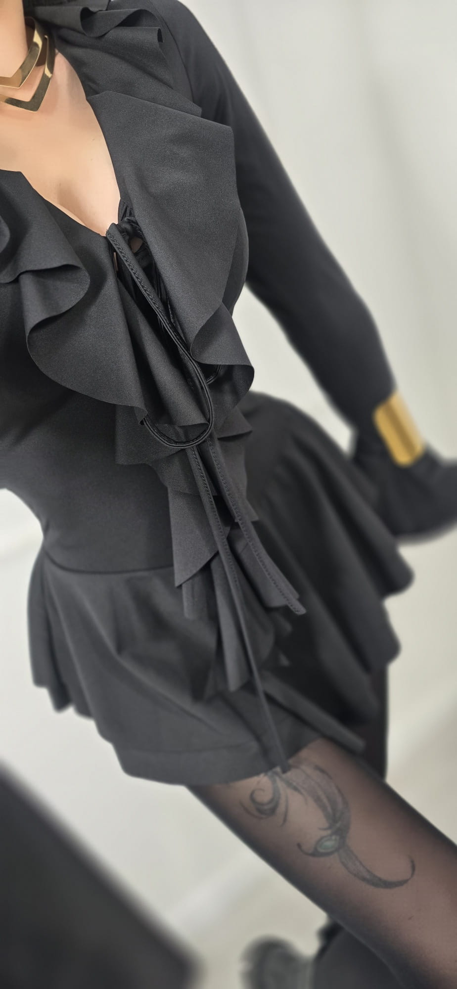 Niesamowicie efektowny kombinezon z wiązaniem oraz falbankami na przodzie.