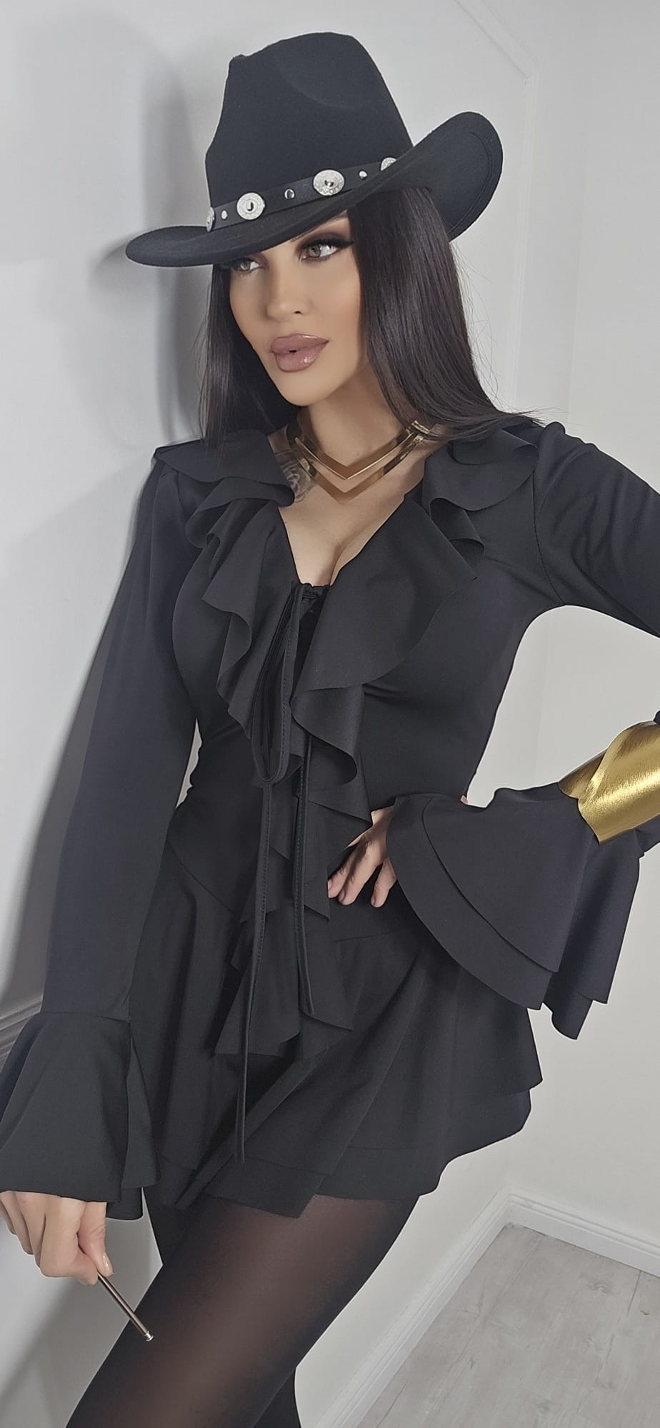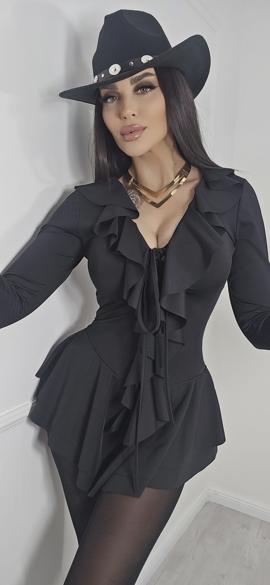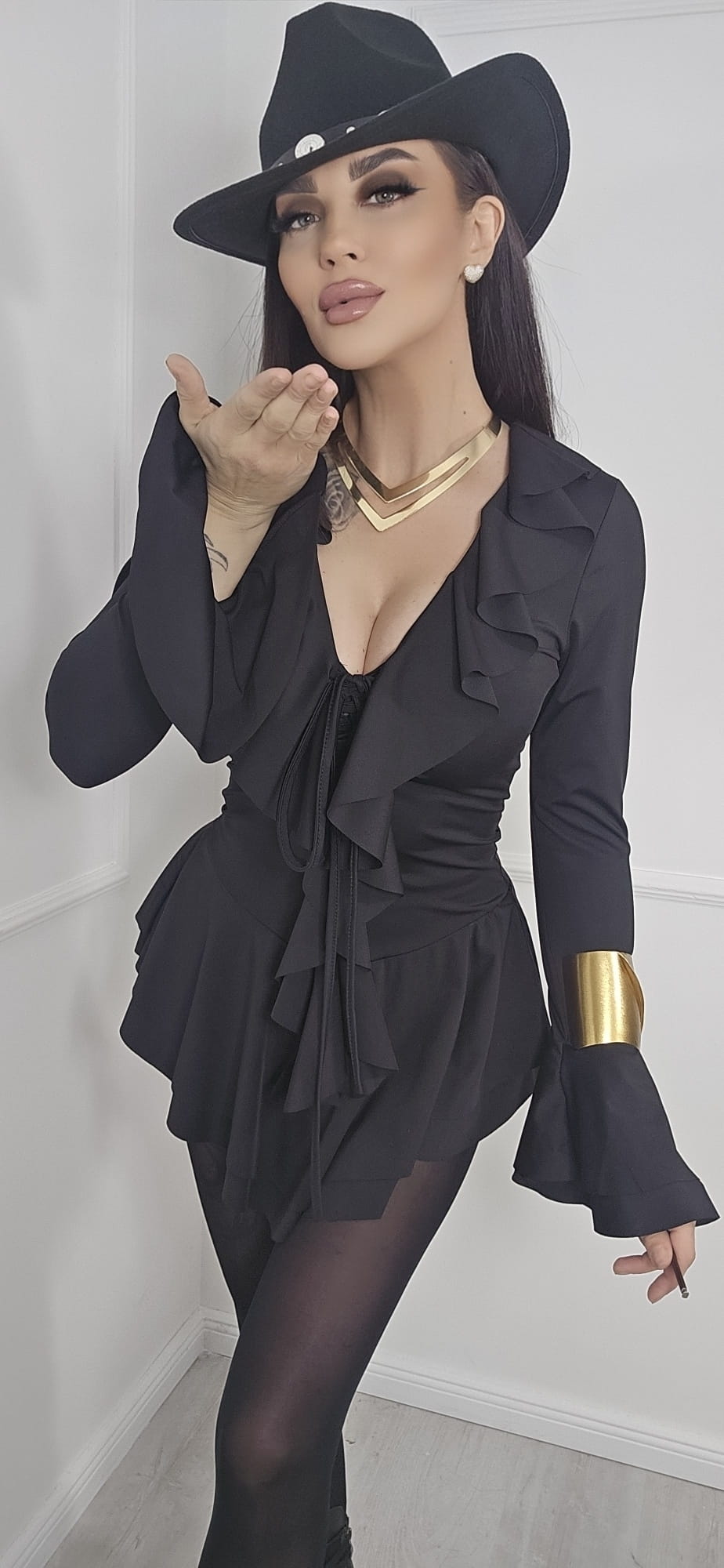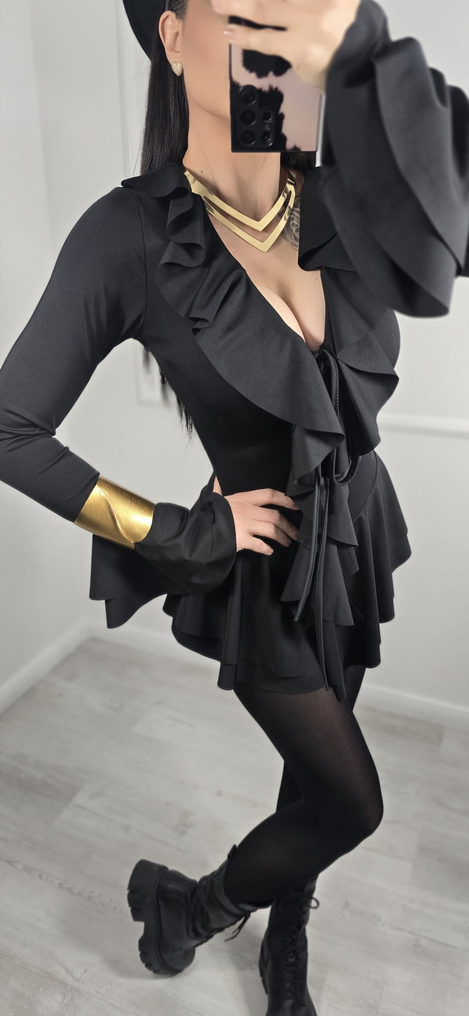 Niesamowicie efektowny kombinezon z wiązaniem oraz falbankami na przodzie.
