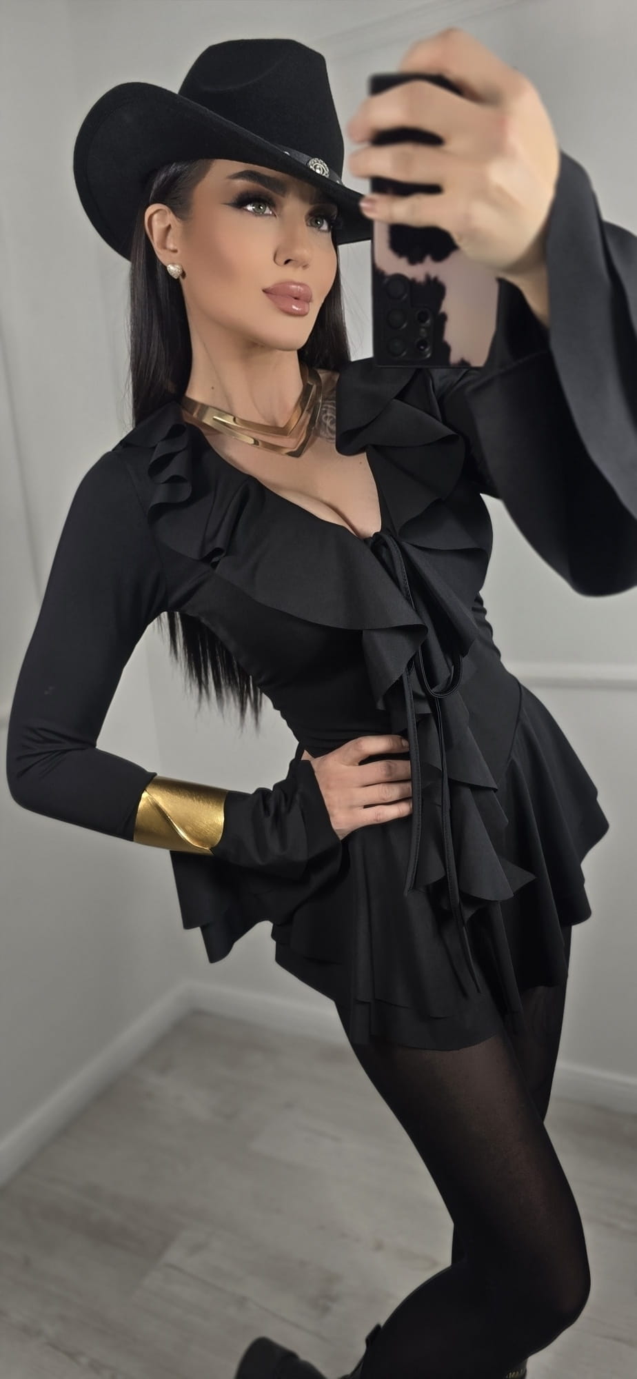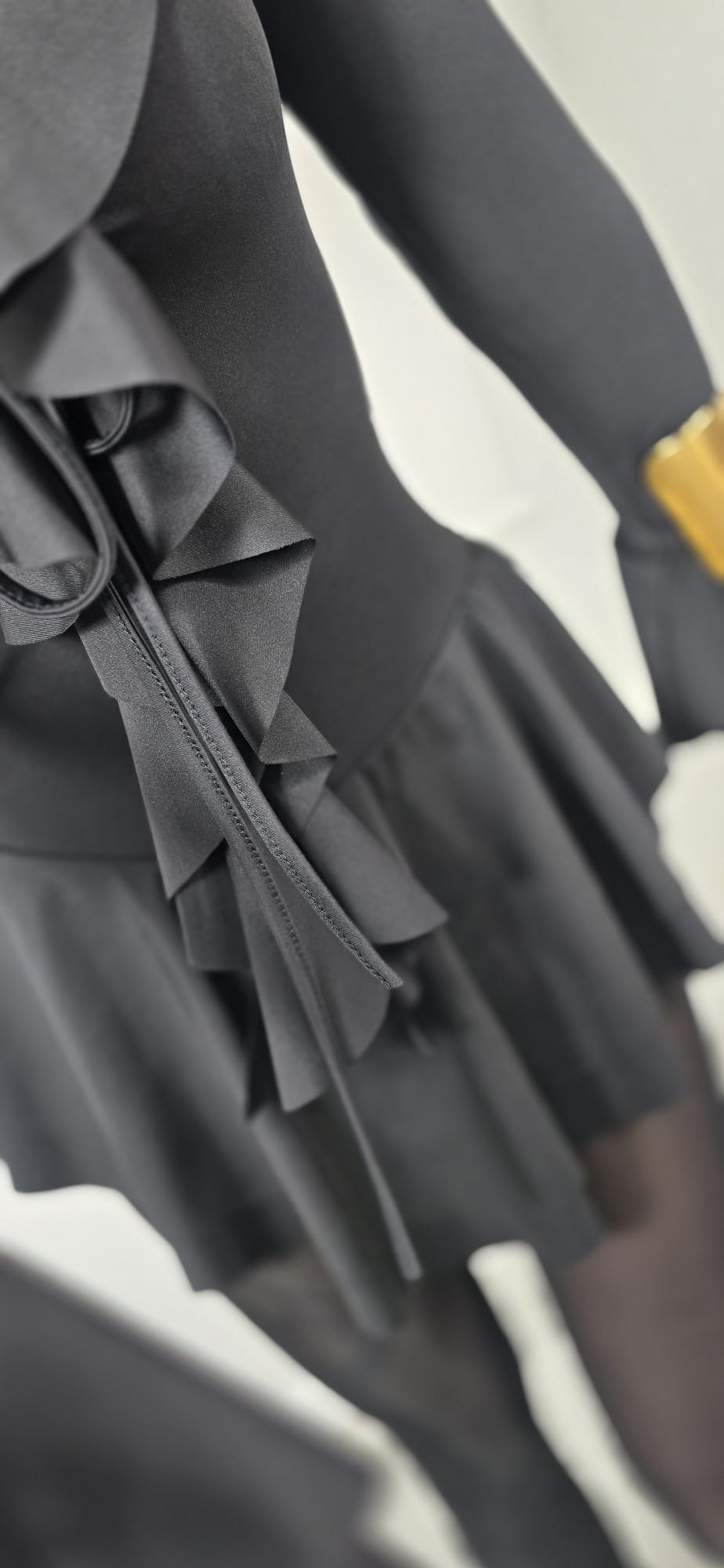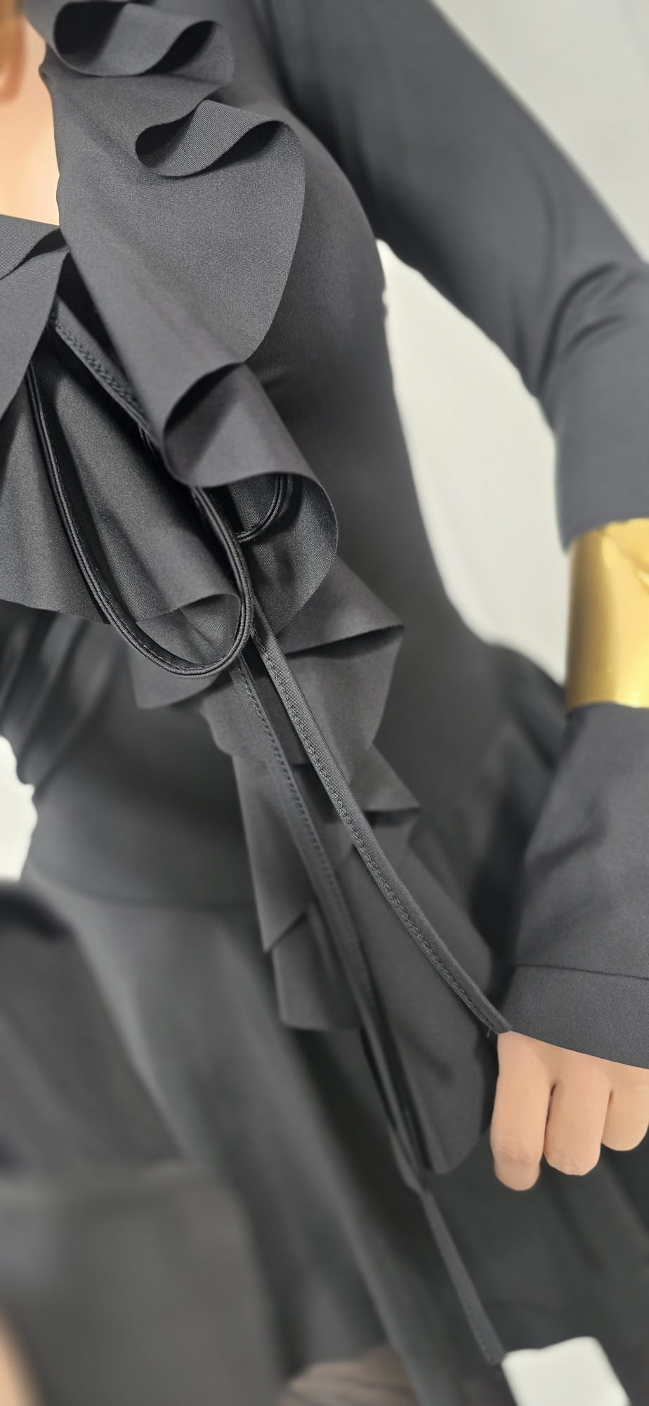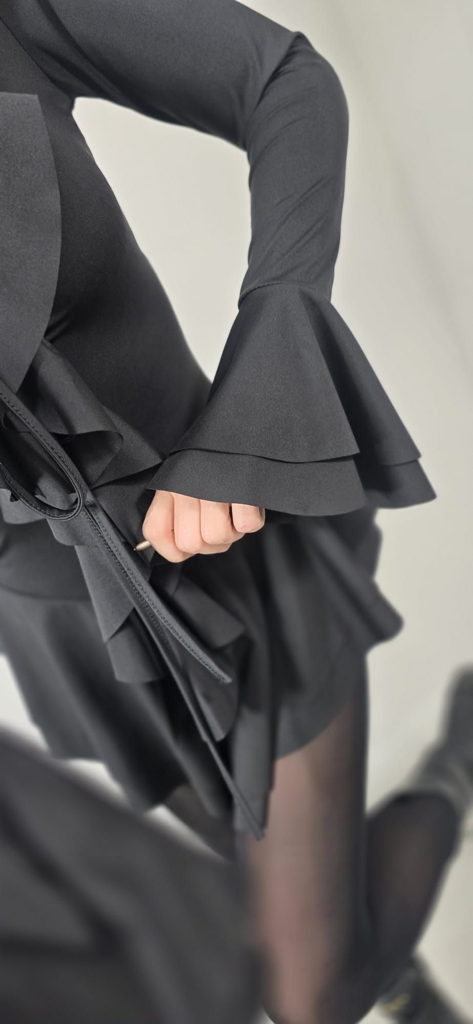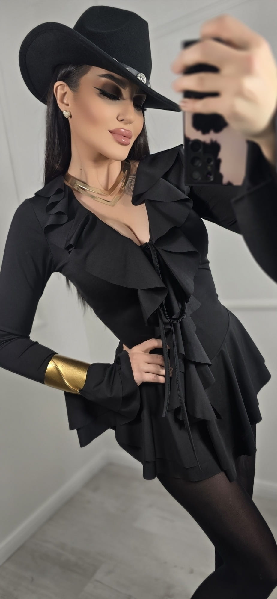 Niesamowicie efektowny kombinezon z wiązaniem oraz falbankami na przodzie.