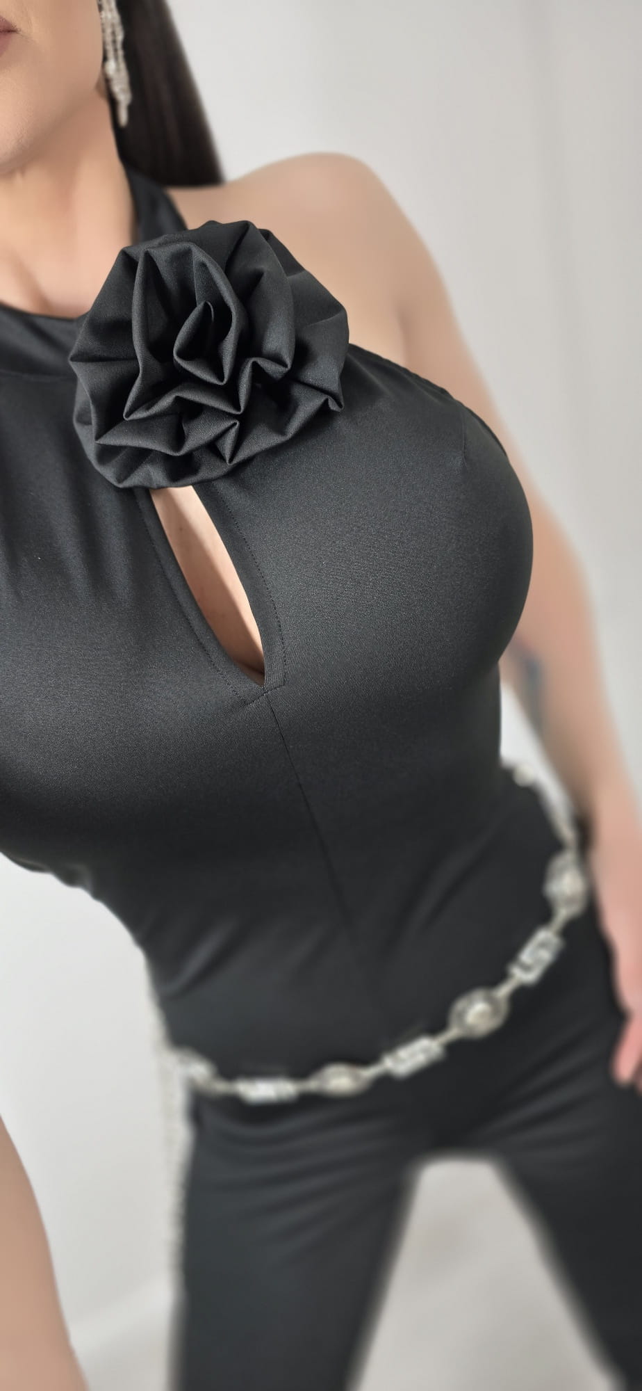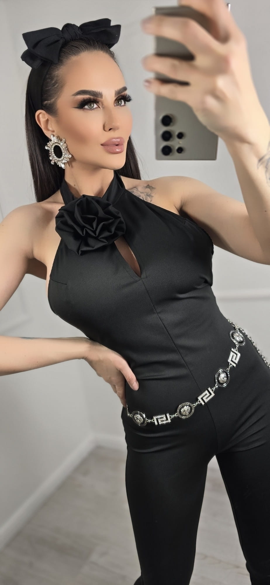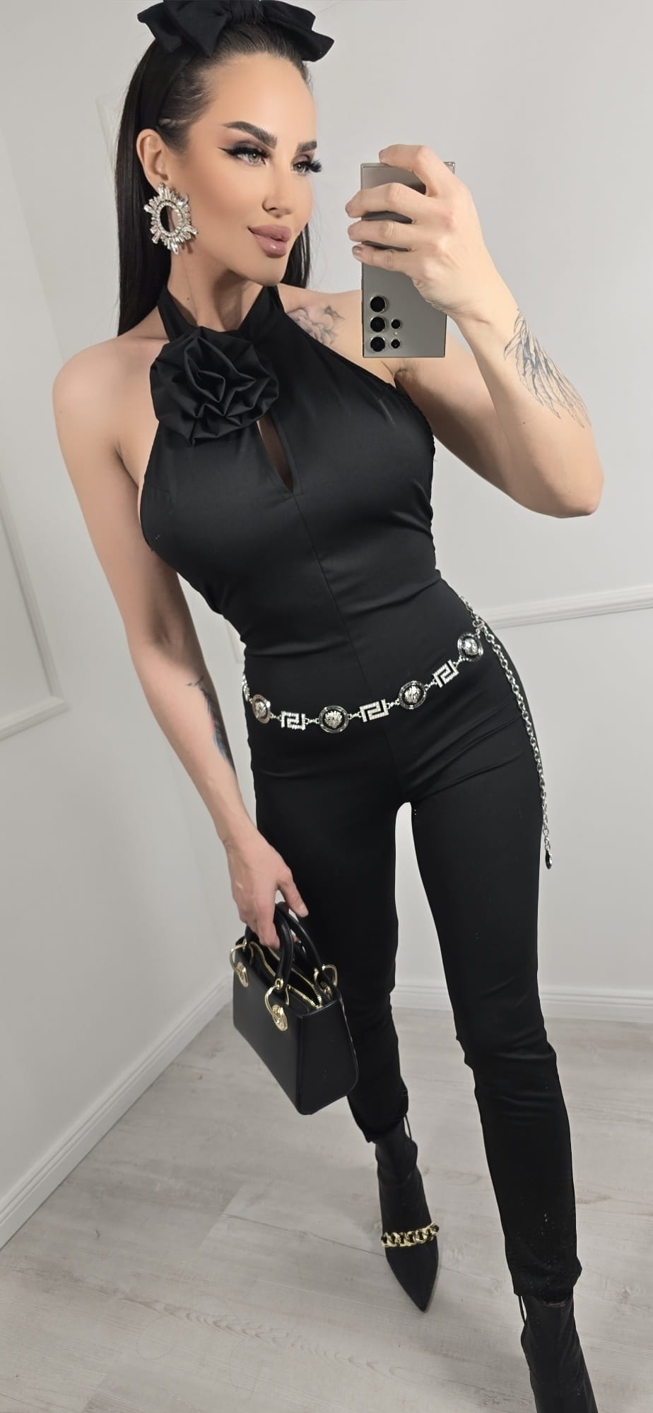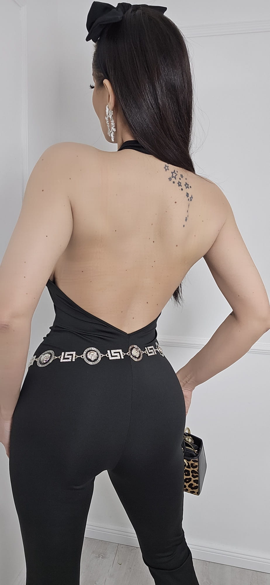 Zjawiskowy kombinezon zapinany na szyi z odkrytymi plecami.