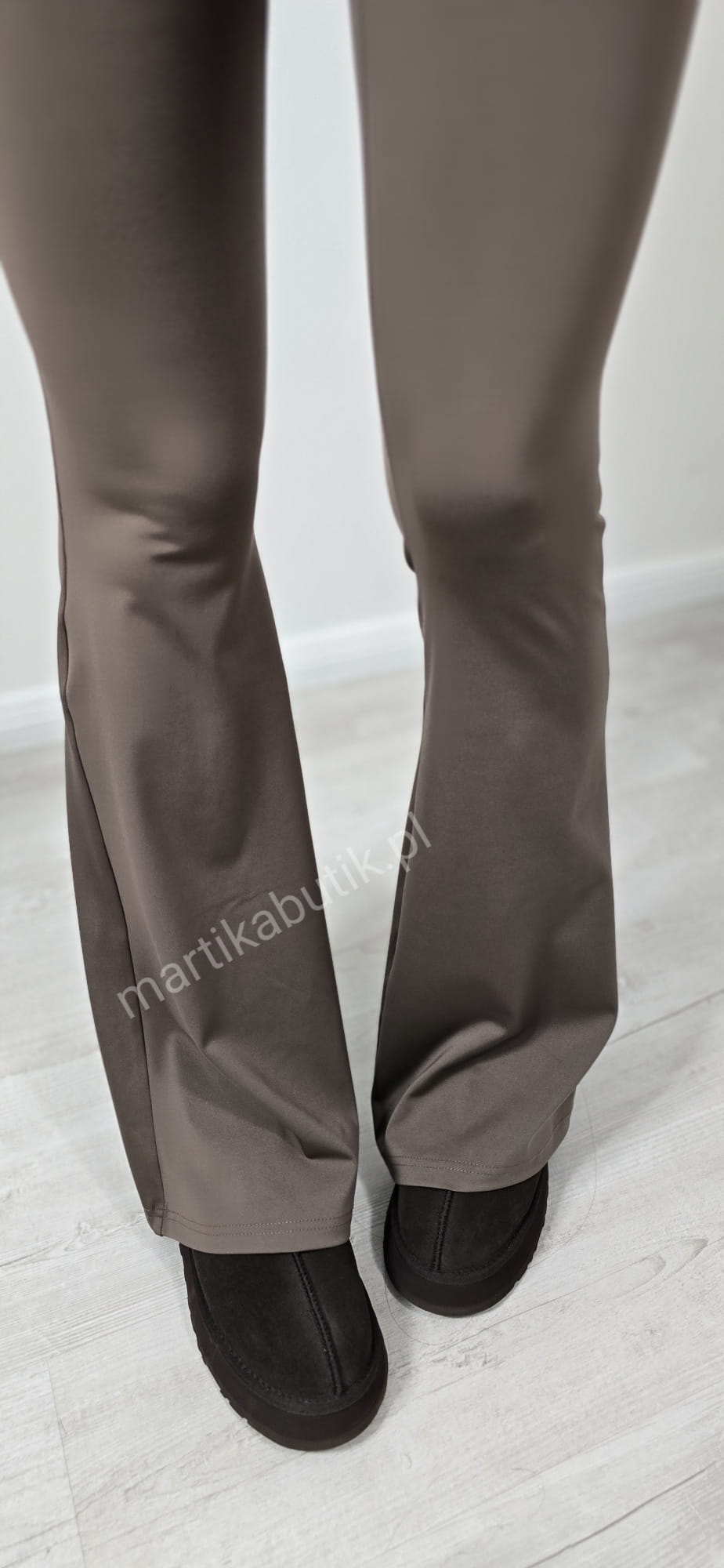 Model z szeroką nogawką typu dzwon z gładkim przodem oraz tyłem zapinanym na zameczek.