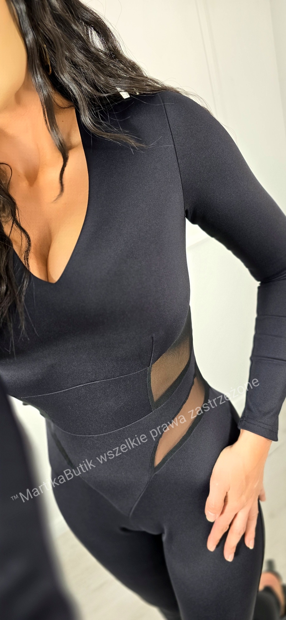 Nasz kombinezon posiada wycięcia siateczkowe w okolicach talii, które pięknie ją podkreśla.