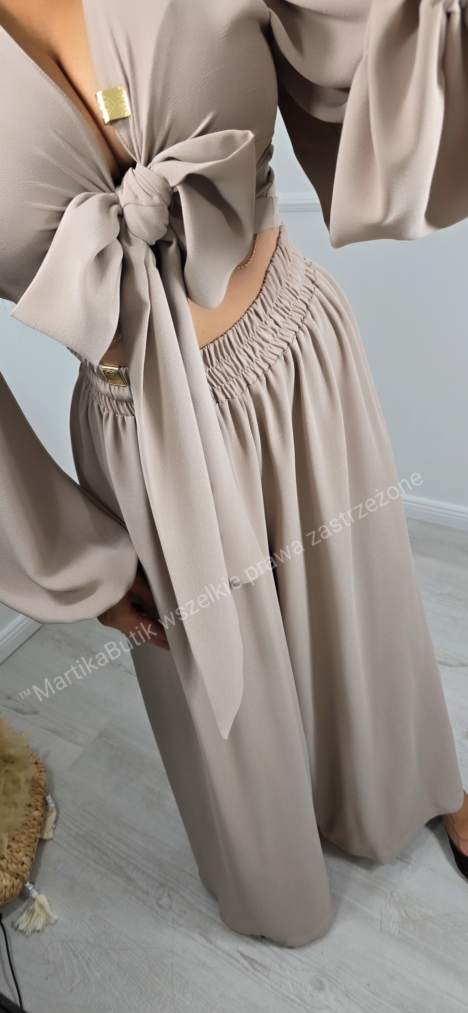 • Detale: Ozdobne wiązanie na środku bluzki, marszczenia przy pasie spodni.