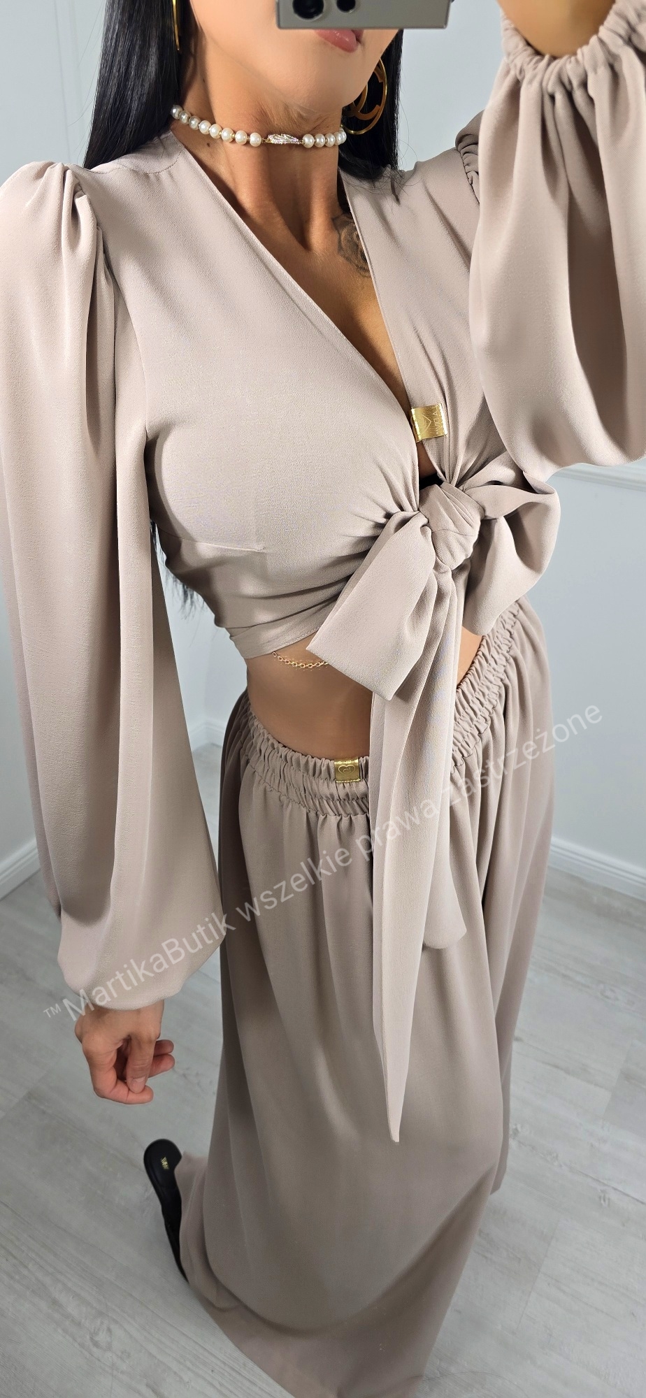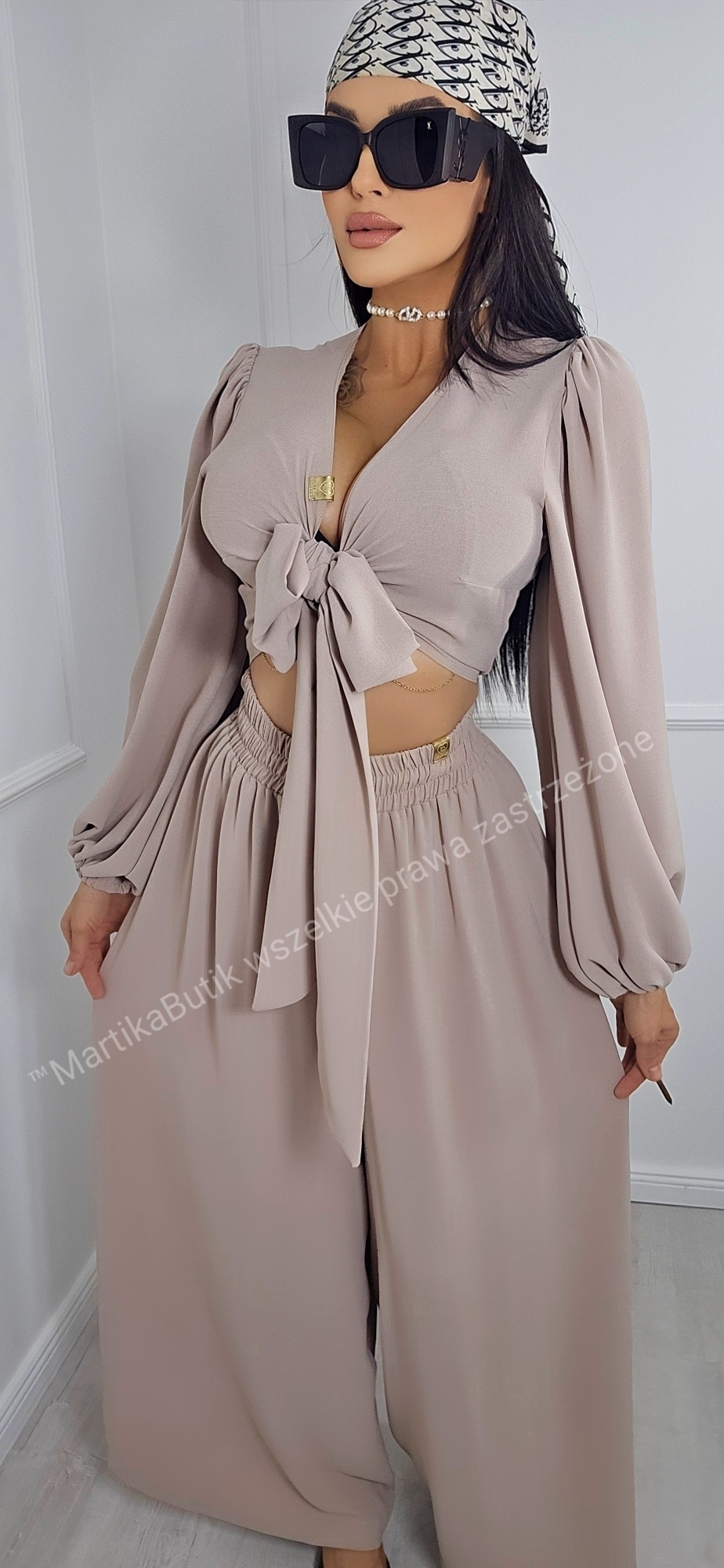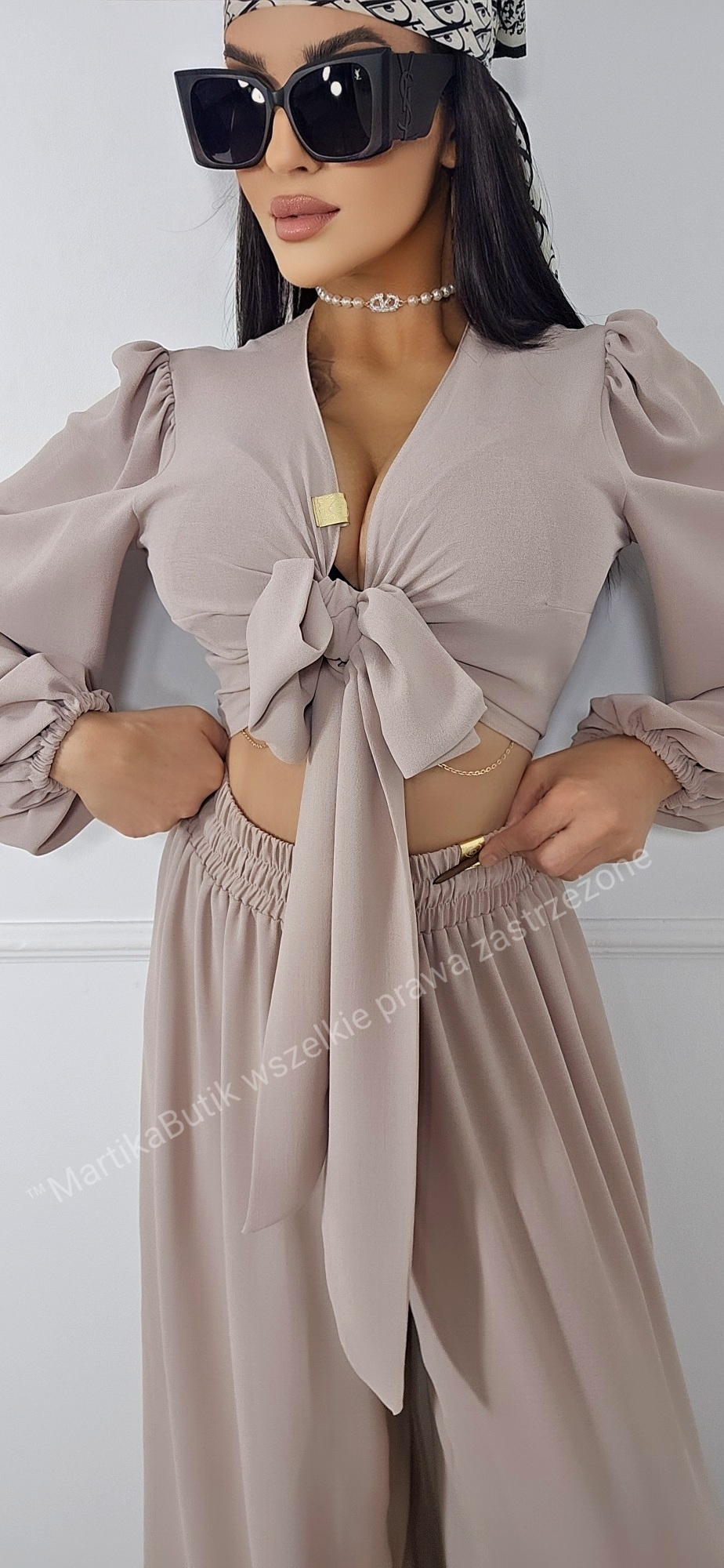 • Bluzka z Efektownym Wiązaniem: Krótki fason typu crop top z głębokim dekoltem w serek (V-neck), który pięknie eksponuje biust. Długie, szerokie rękawy zakończone subtelnym ściągaczem nadają całości lekkości i romantycznego charakteru.