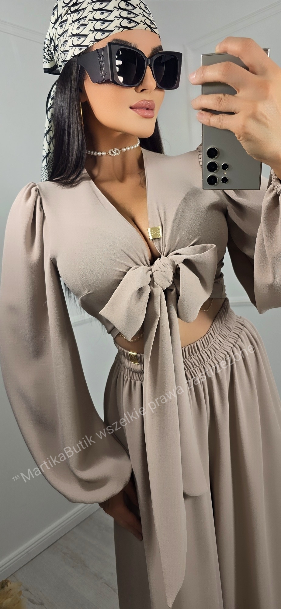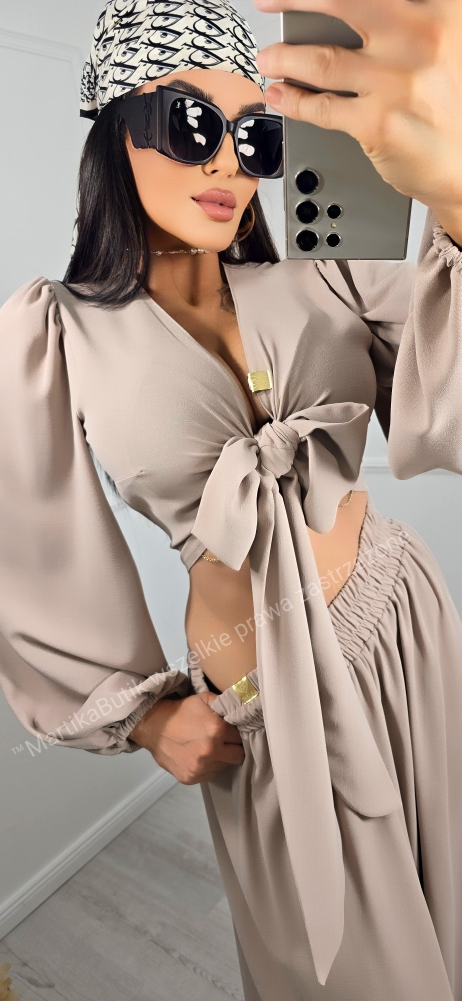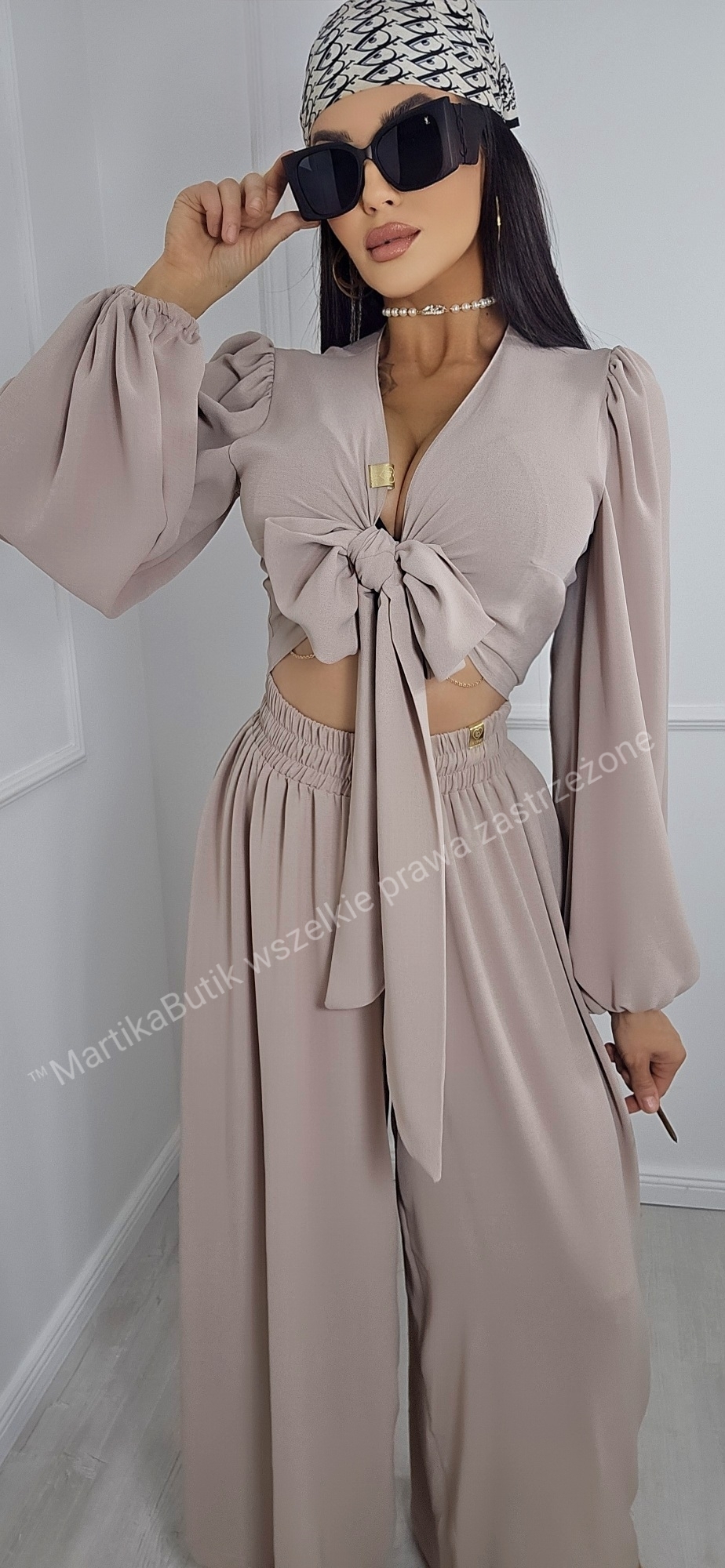 • Bluzka z Efektownym Wiązaniem: Krótki fason typu crop top z głębokim dekoltem w serek (V-neck), który pięknie eksponuje biust. Długie, szerokie rękawy zakończone subtelnym ściągaczem nadają całości lekkości i romantycznego charakteru.