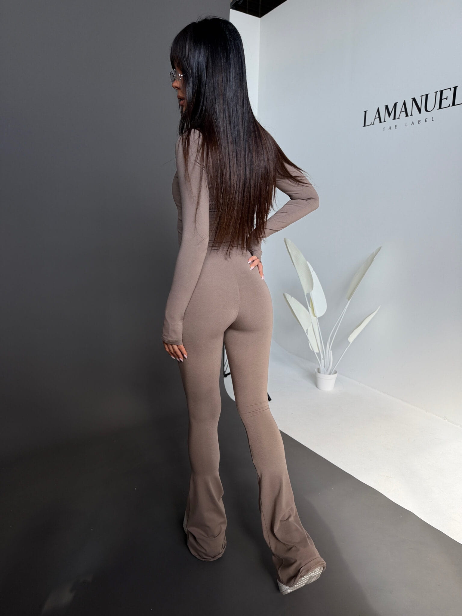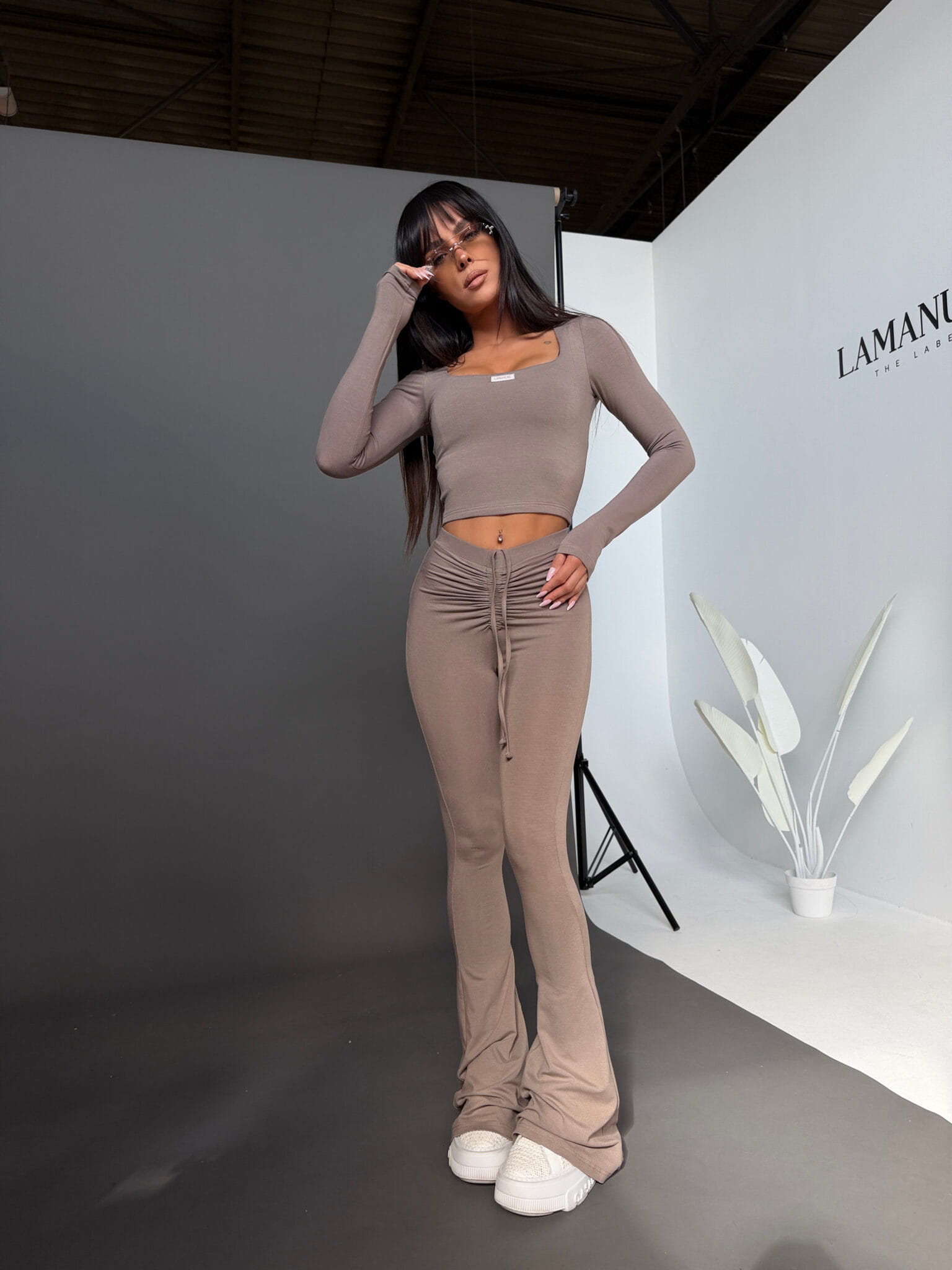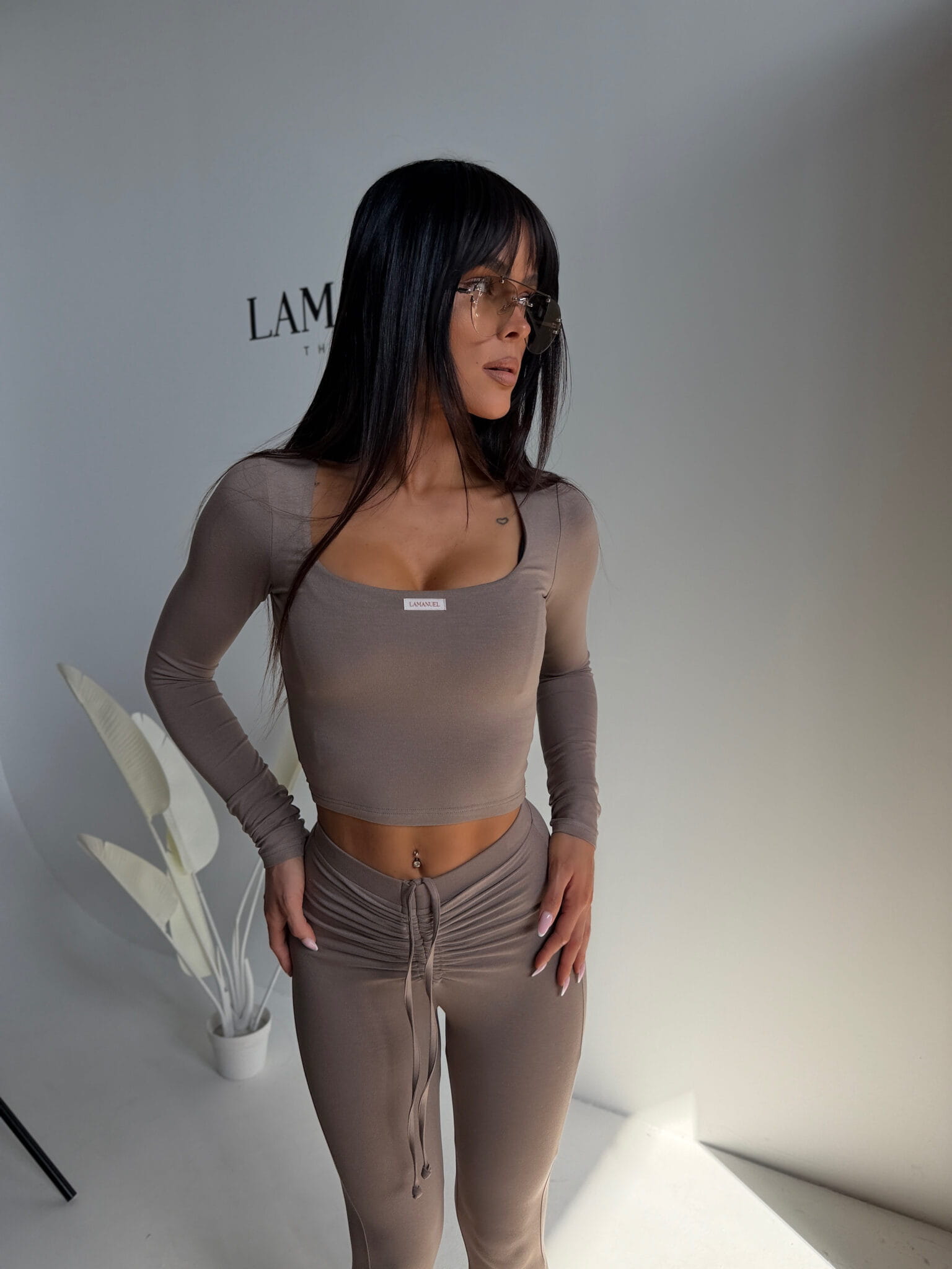 Komplet wykonany z miękkiej, elastycznej wiskozy, która dopasowuje się do sylwetki i podkreśla jej kształt. Składa się z dopasowanej bluzki z długim rękawem i kobiecym, kwadratowym dekoltem oraz legginsów z efektownym marszczeniem i regulacją w pasie. Materiał jest przyjemny w dotyku, lekki i komfortowy w noszeniu, a całość tworzy spójny, nowoczesny zestaw o wyrazistym, kobiecym charakterze.