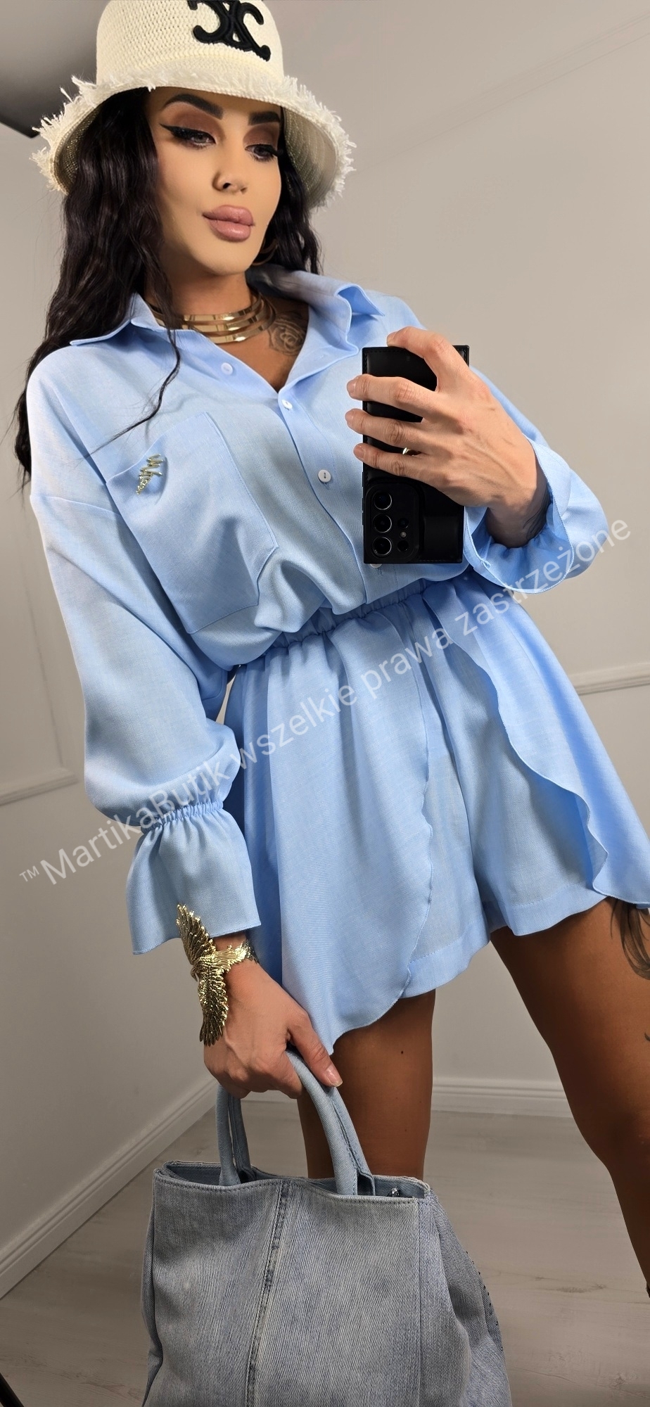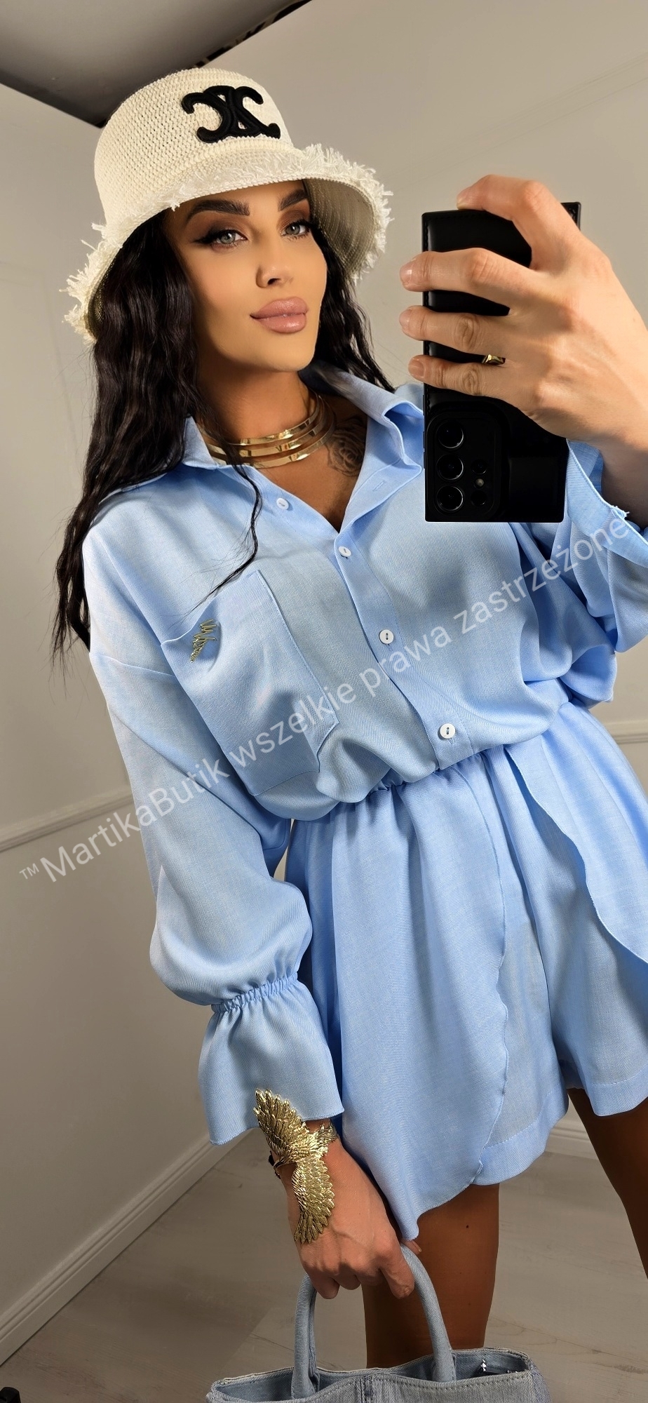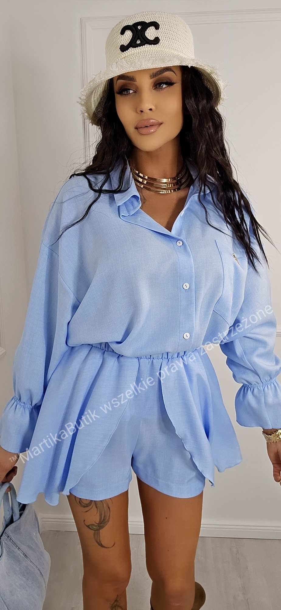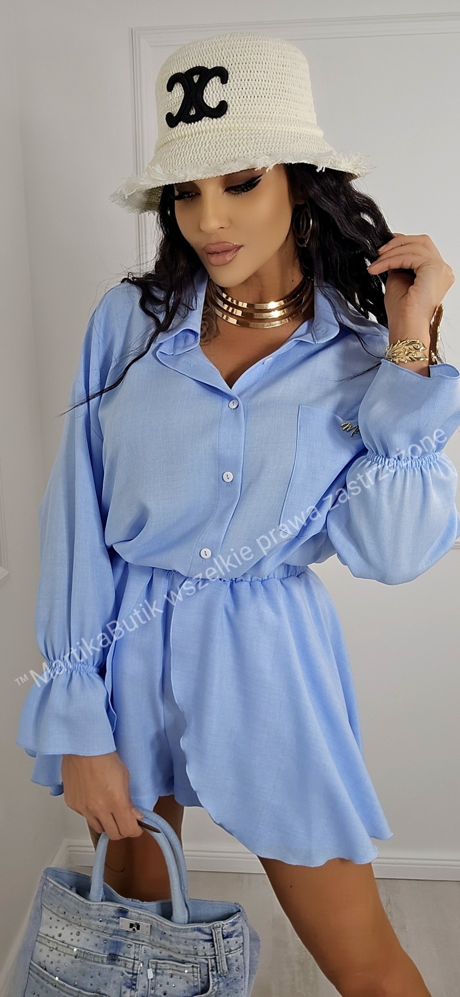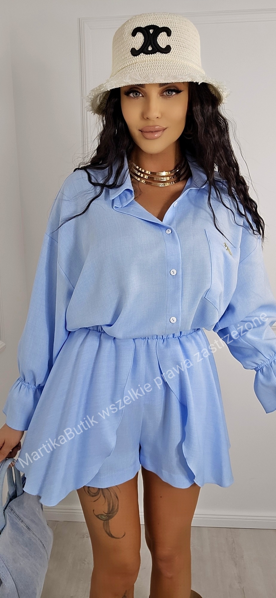 Koszula Oversize: Luźny fason z długim rękawem zakończonym stylowym ściągaczem. Zapinana na guziki, z klasycznym kołnierzykiem, zapewnia maksymalny komfort i przewiewność. Do zestawu dołączona jest złota broszka, która dodaje elegancji. Rękawy zakończone falbanką z gumką.