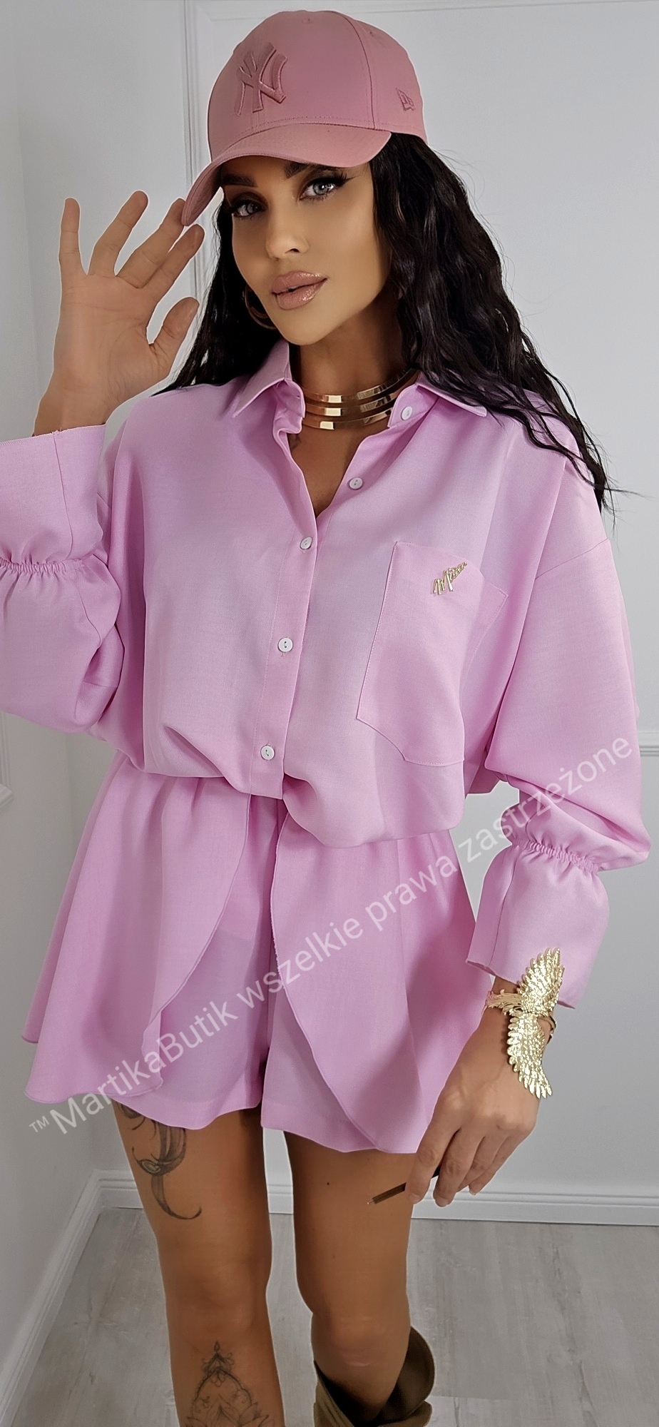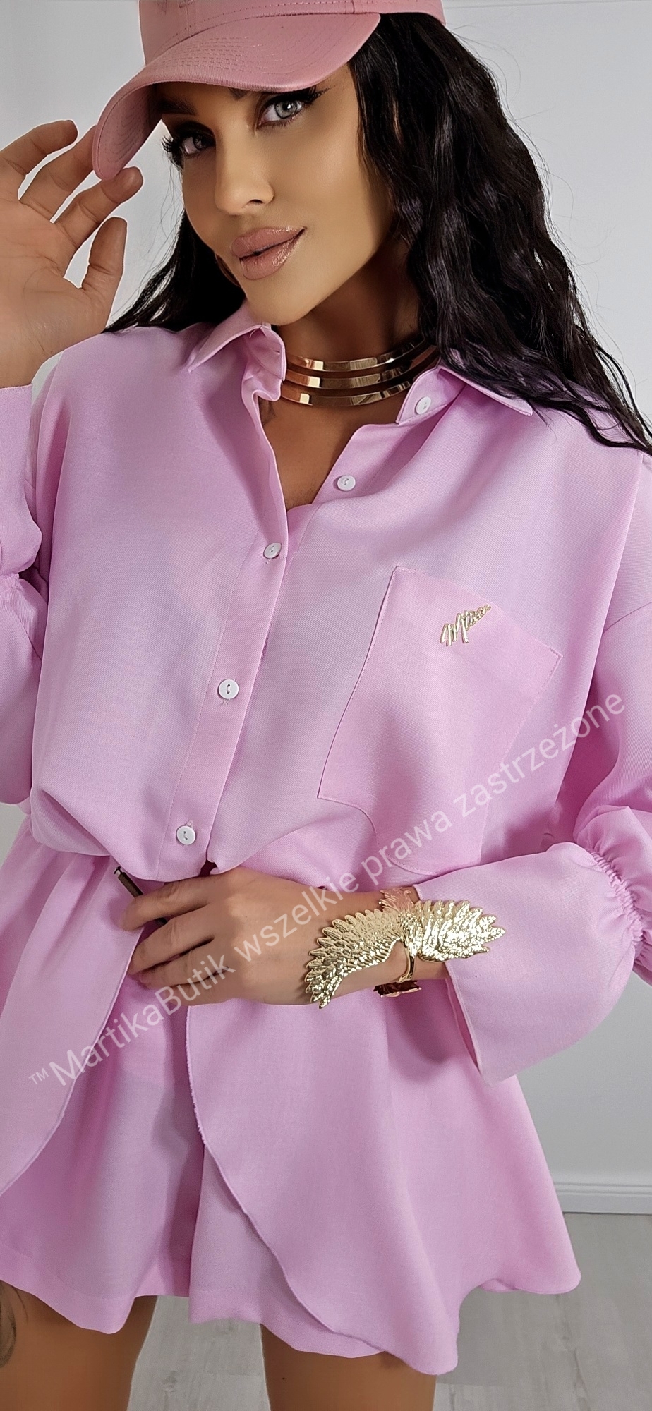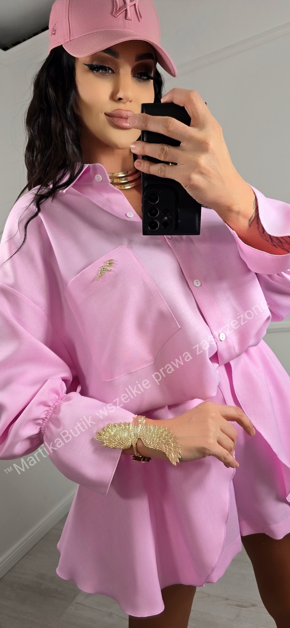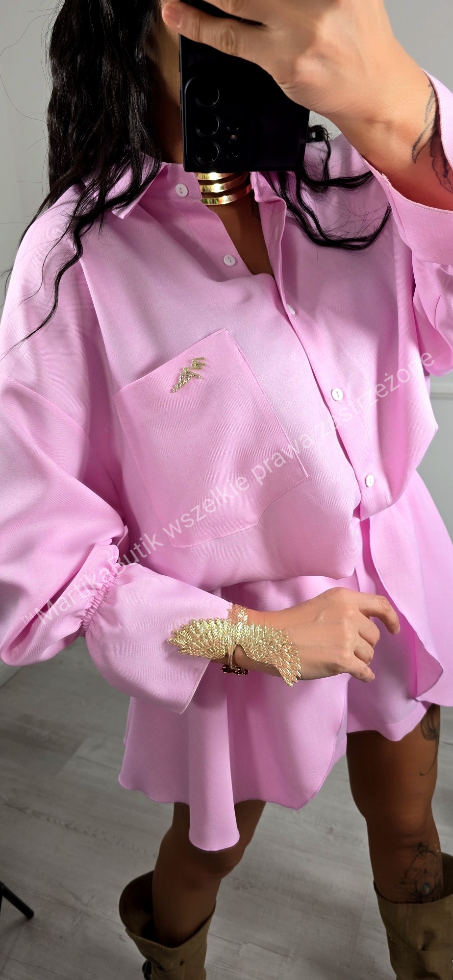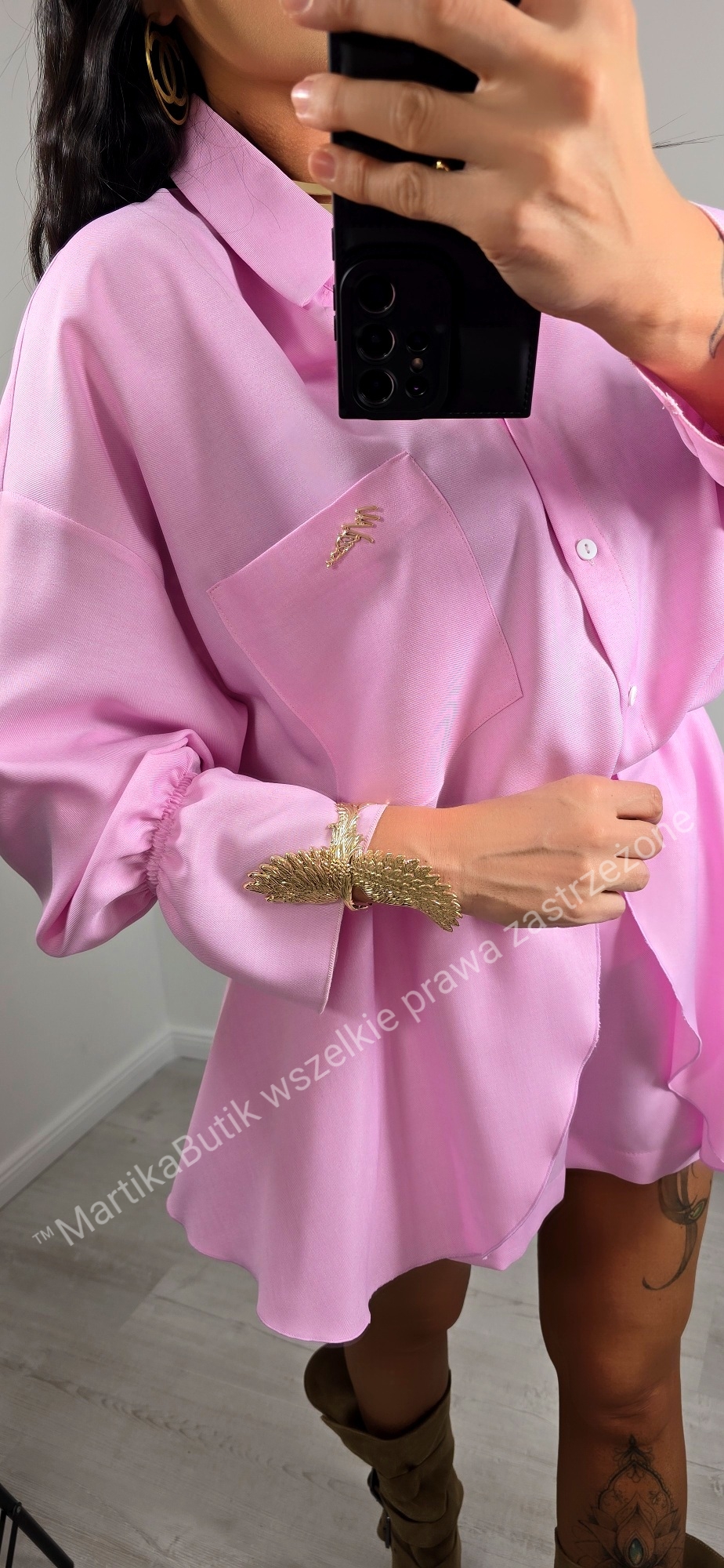 • Koszula Oversize: Luźny fason z długim rękawem zakończonym stylowym ściągaczem. Zapinana na guziki, z klasycznym kołnierzykiem, zapewnia maksymalny komfort i przewiewność. Do zestawu dołączona jest złota broszka, która dodaje elegancji. Rękawy zakończone falbanką z gumką.