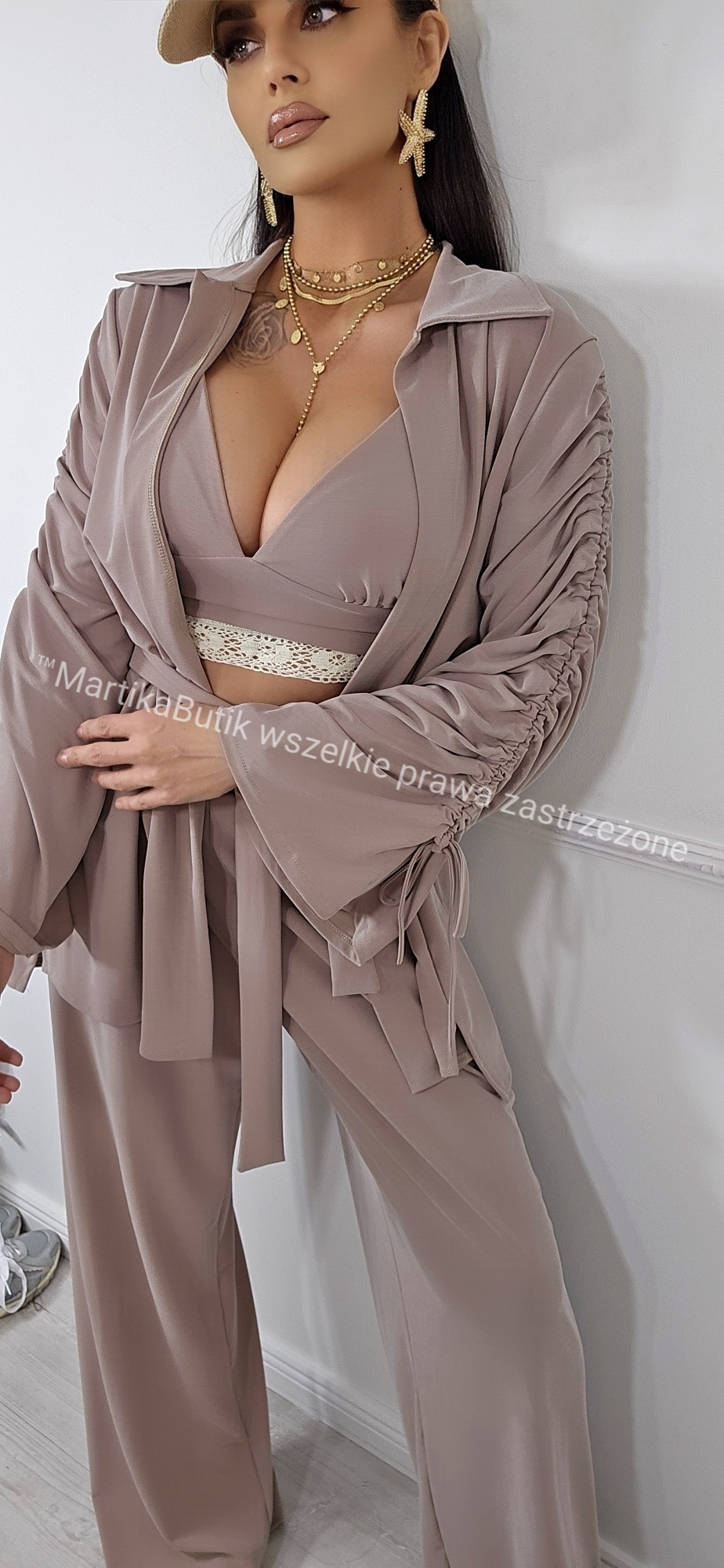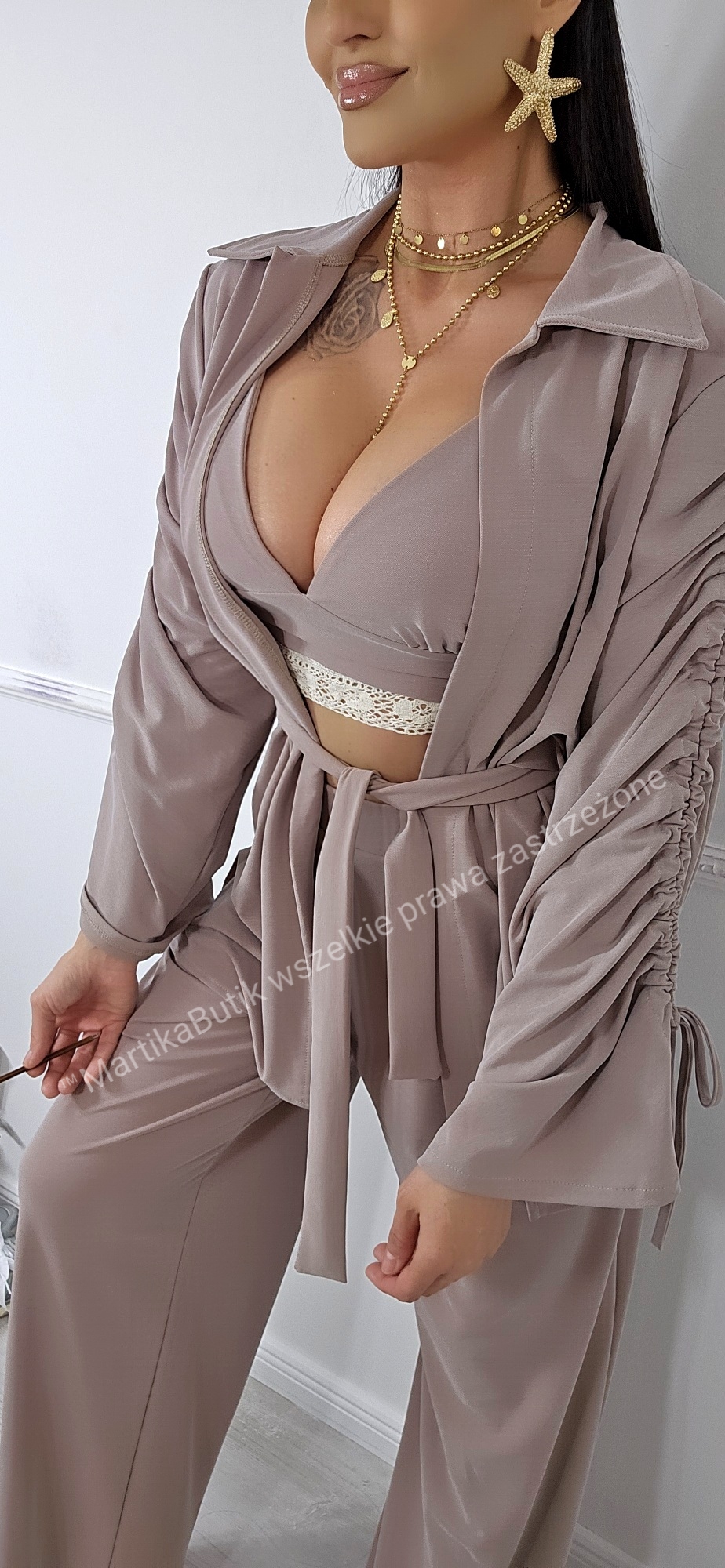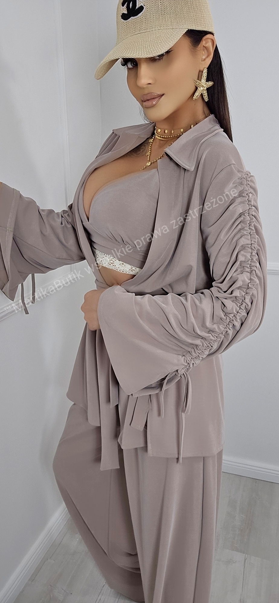 • Efektowne rękawy: Długie rękawy z gęstym, pionowym marszczeniem (guma/ściągacz), które nadaje im objętości i nowoczesnego, rzeźbiarskiego wyglądu.