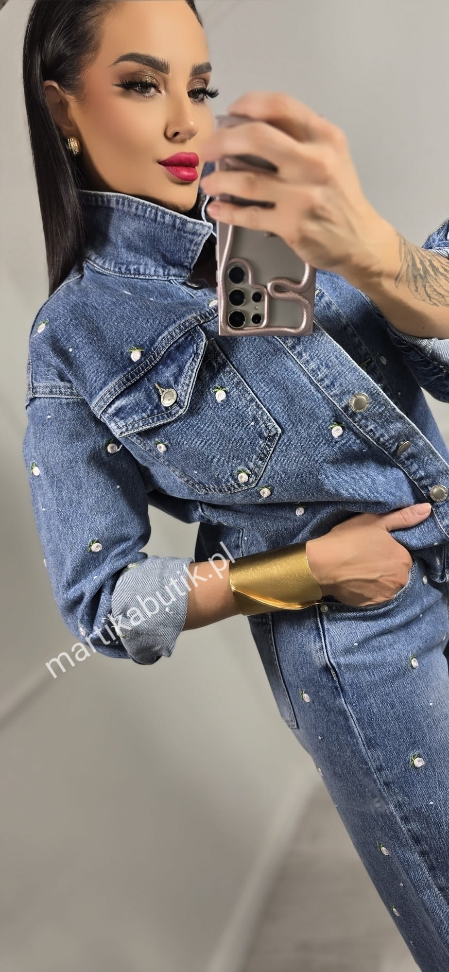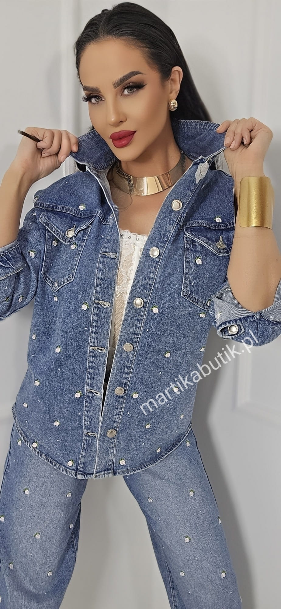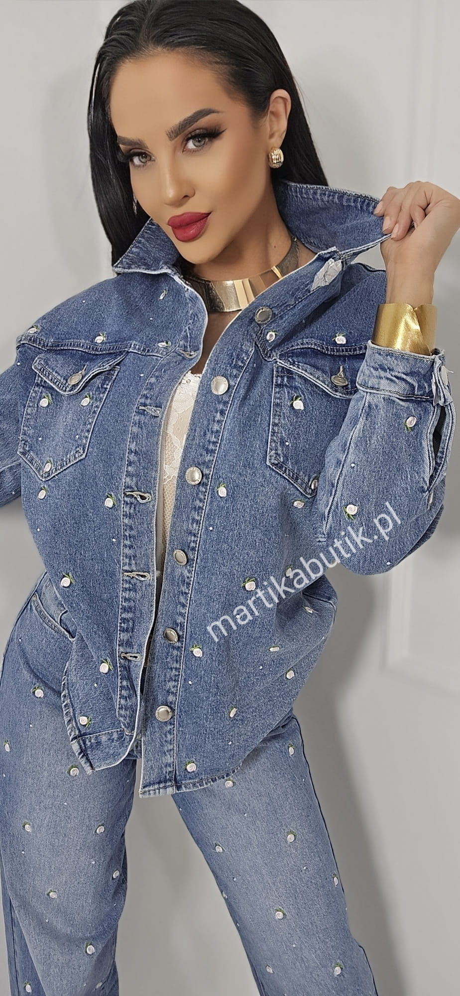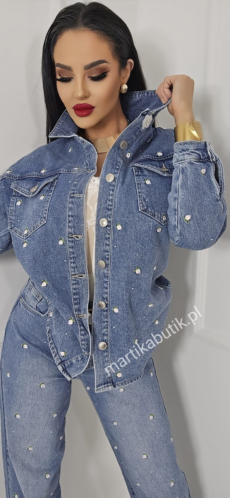Jeansowa kurtka o fasonie oversize wykonana z najwyższej jakości denimu w haftowane różyczki