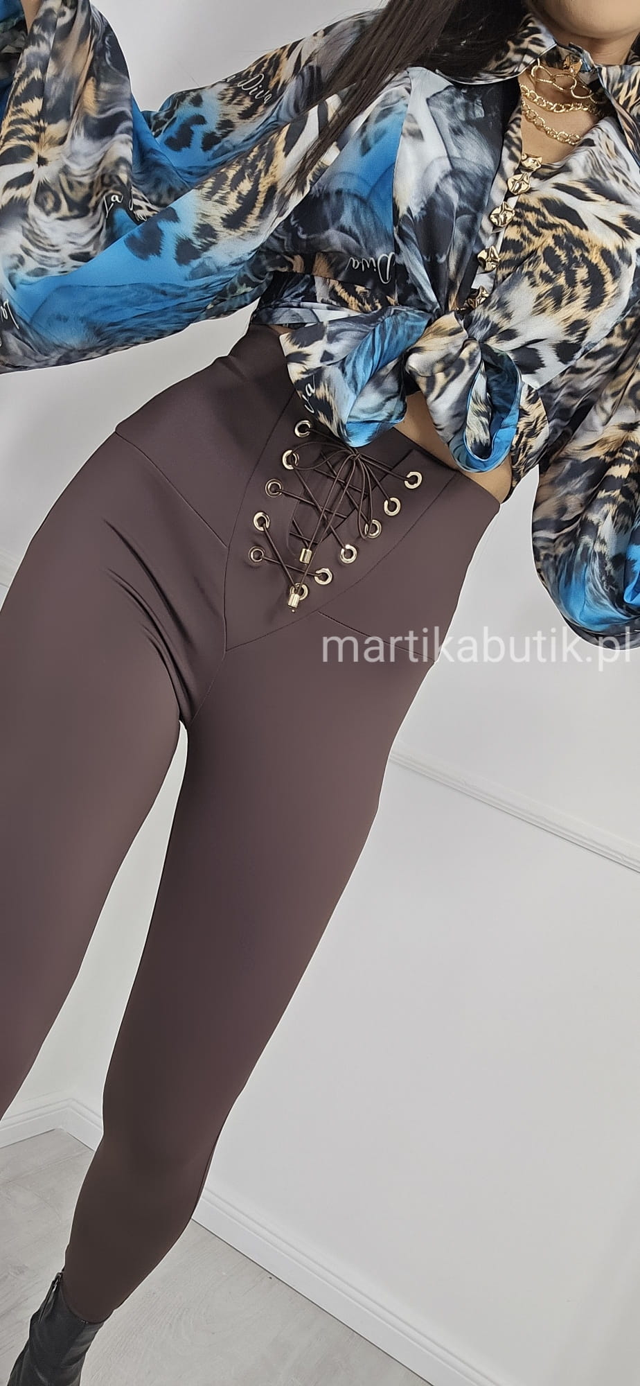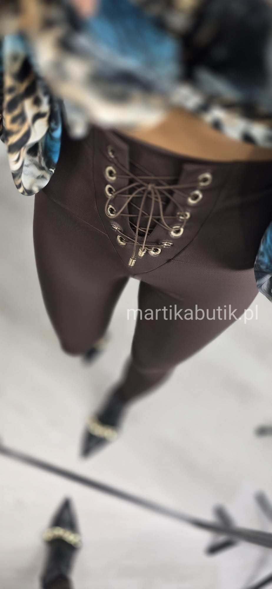 Obłędnie skrojone, bardzo wysoki stan podkreślony wiązaniem.