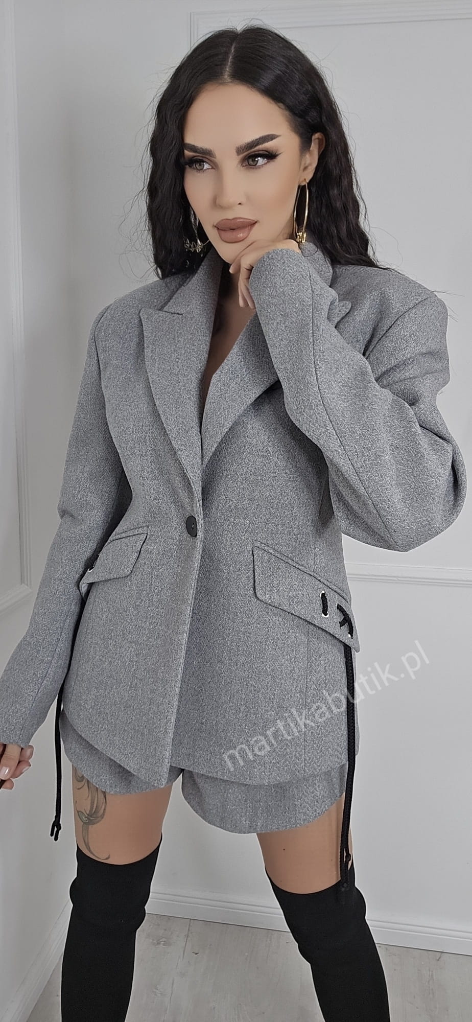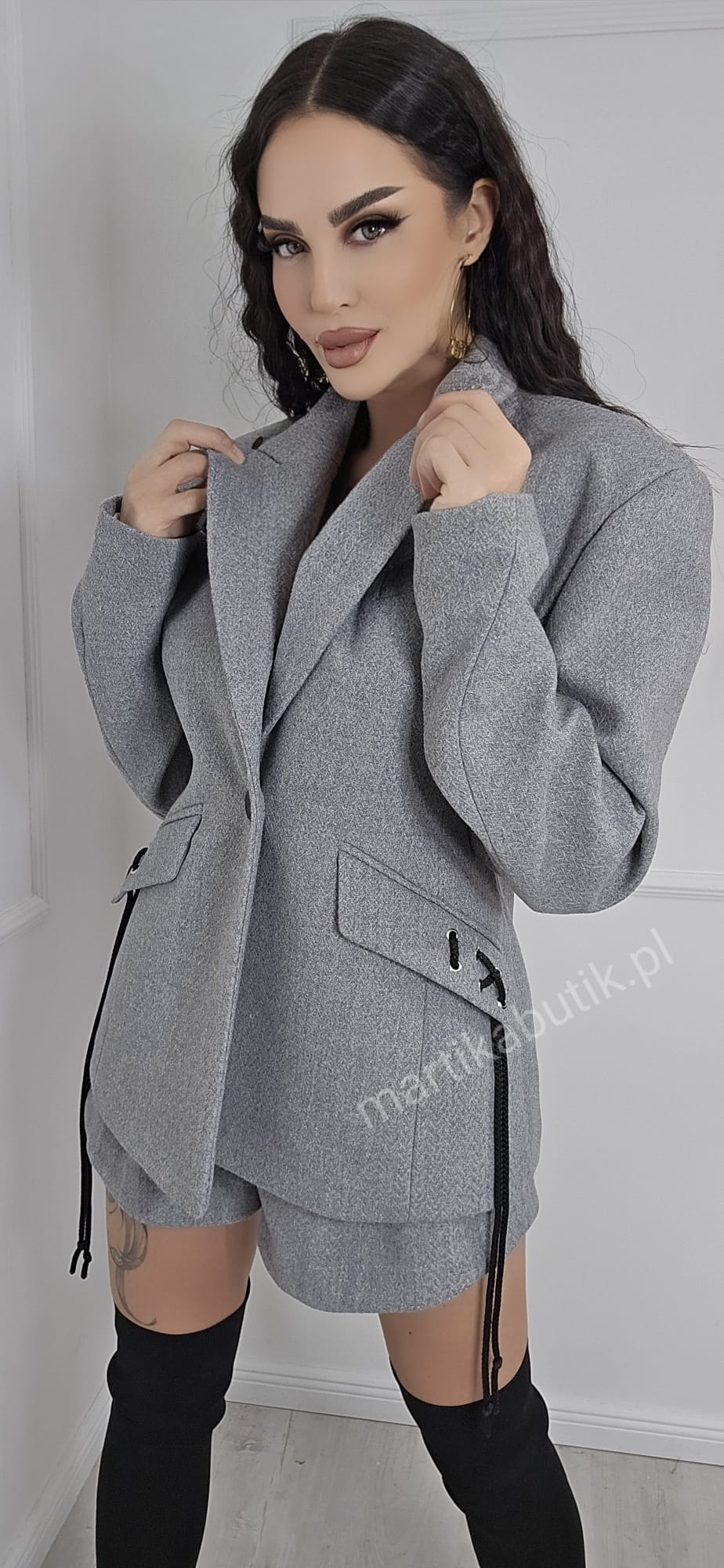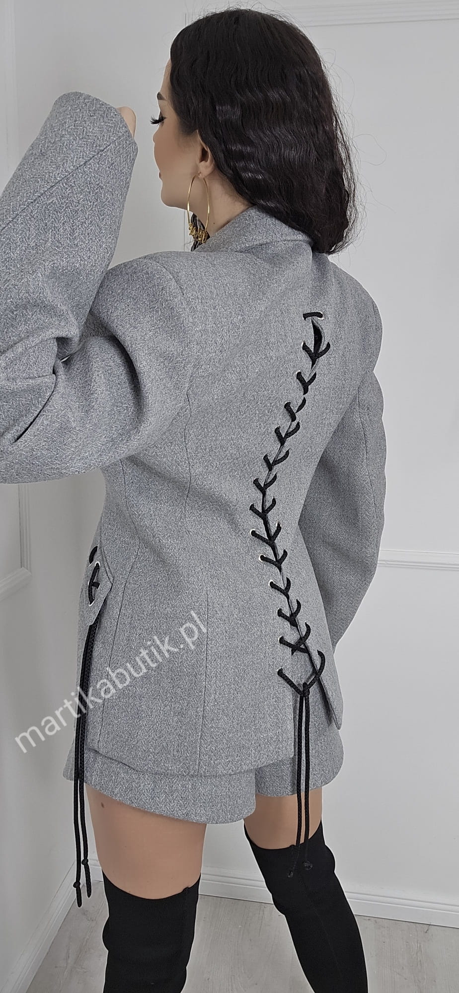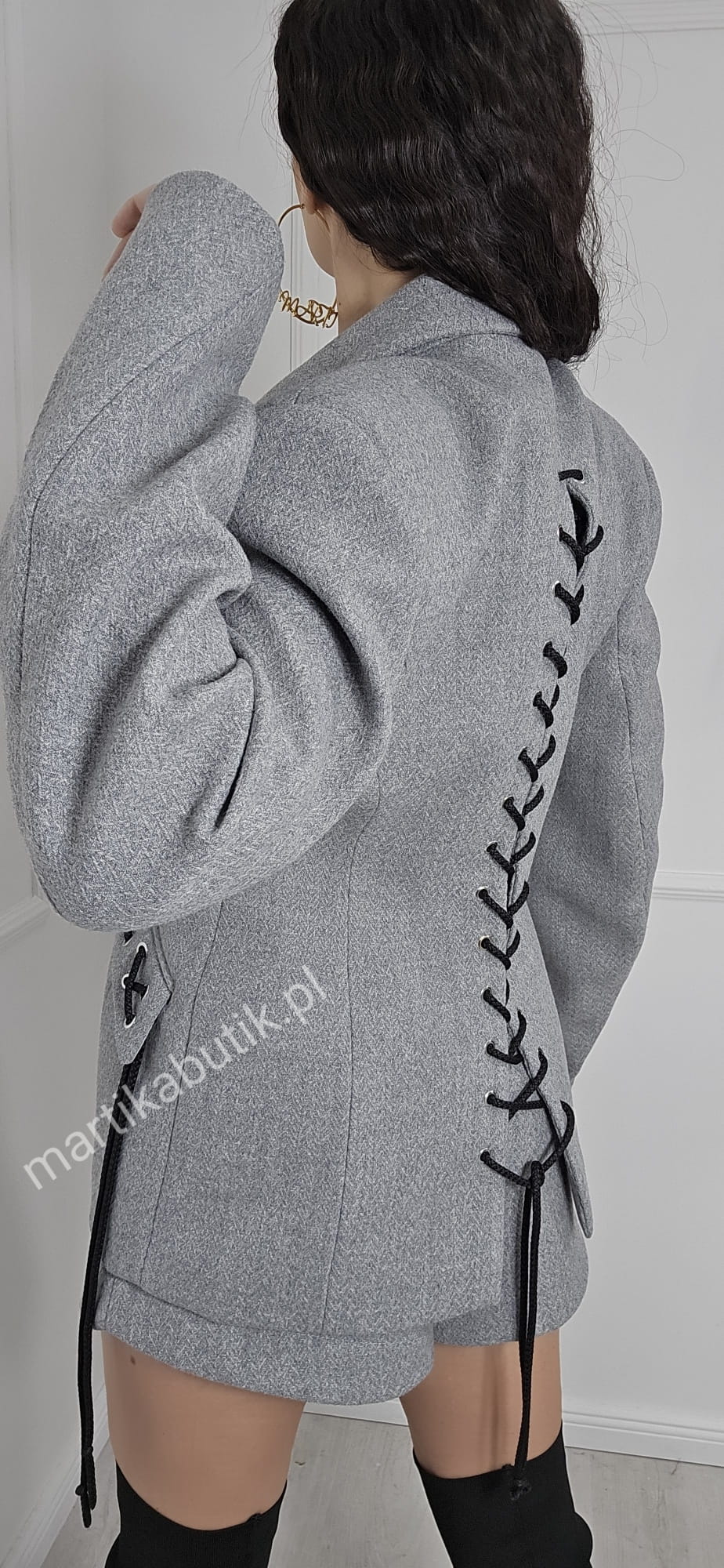 Ten model to doskonała propozycja dla kobiet chcących się wyróżniać. Charakterystyczne wiązanie na plecach wyróżnia ją na tle innych marynarek.