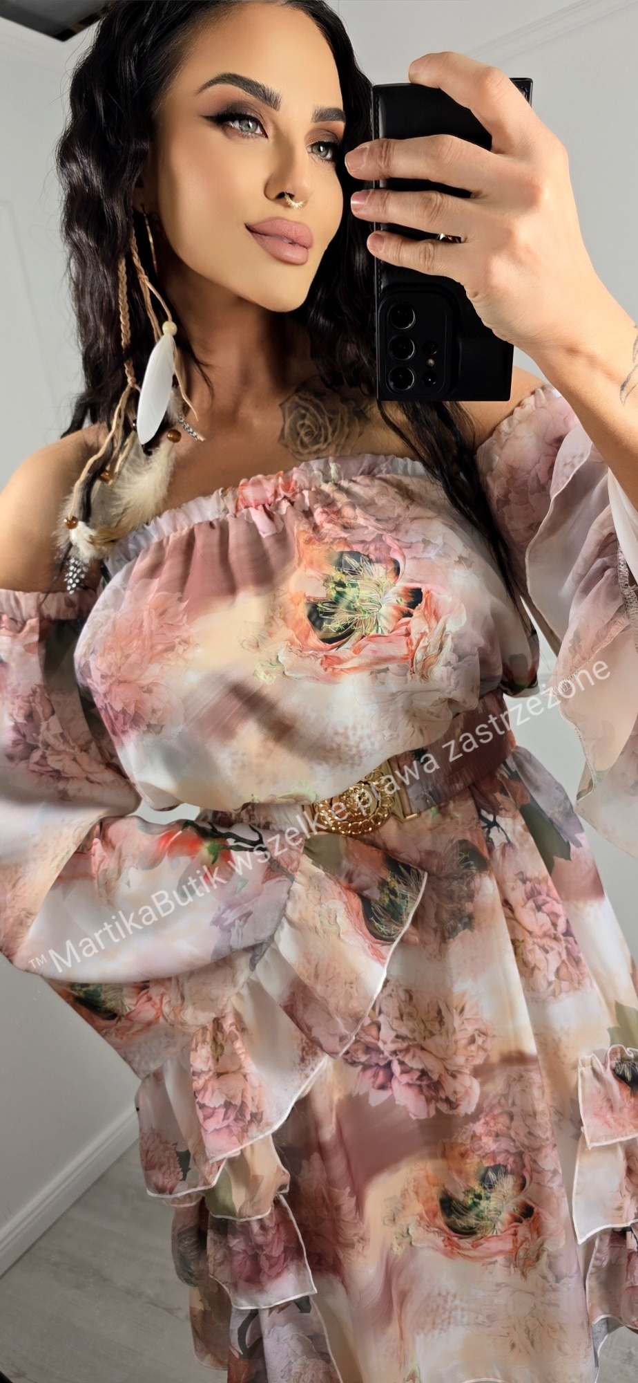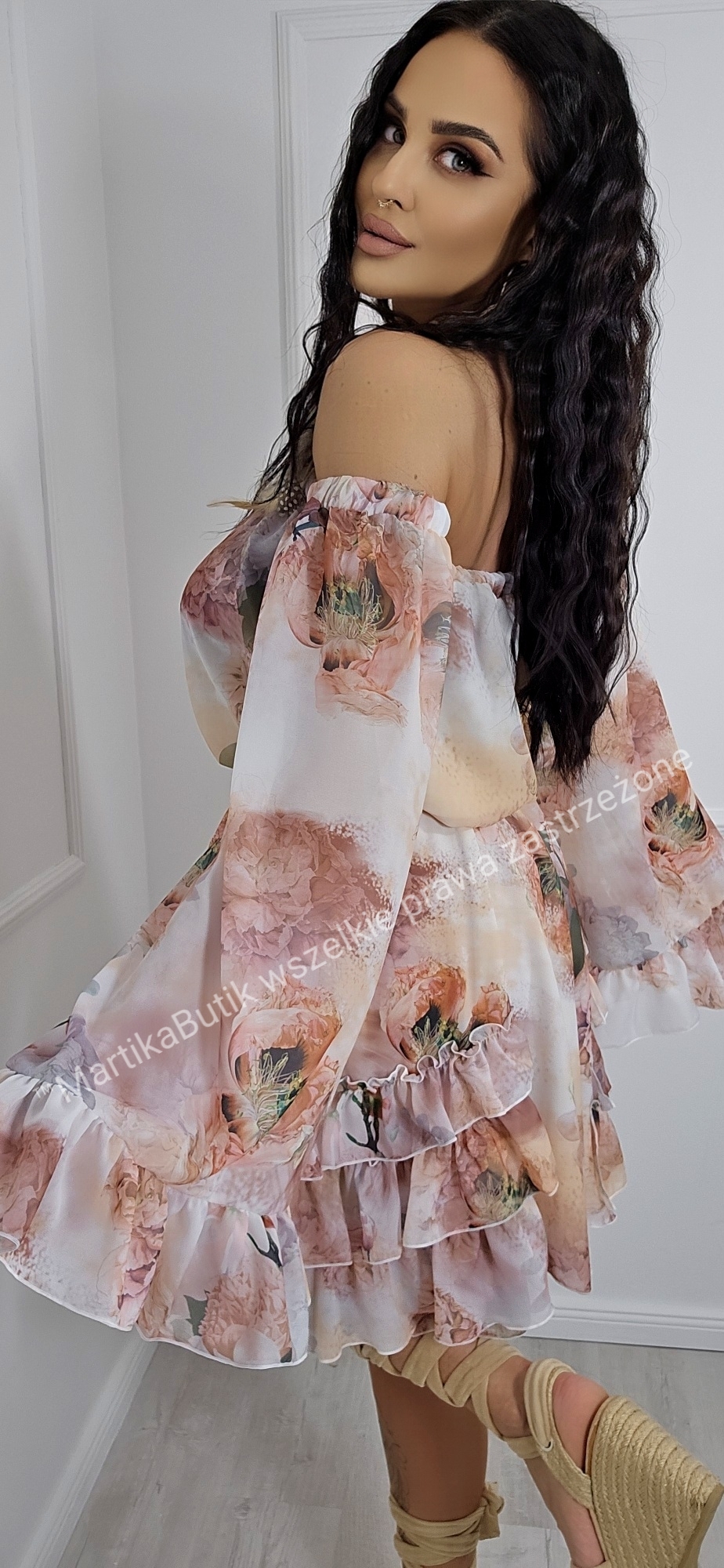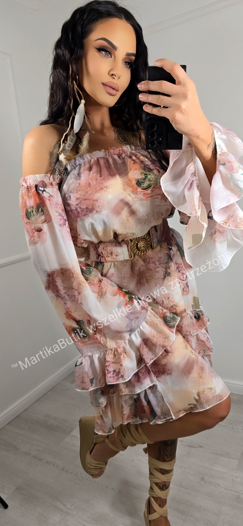 Bogate falbanki, marszczony pasek ze złotą klamrą w komplecie, dzięki któremu sama regulujesz długość sukienki.