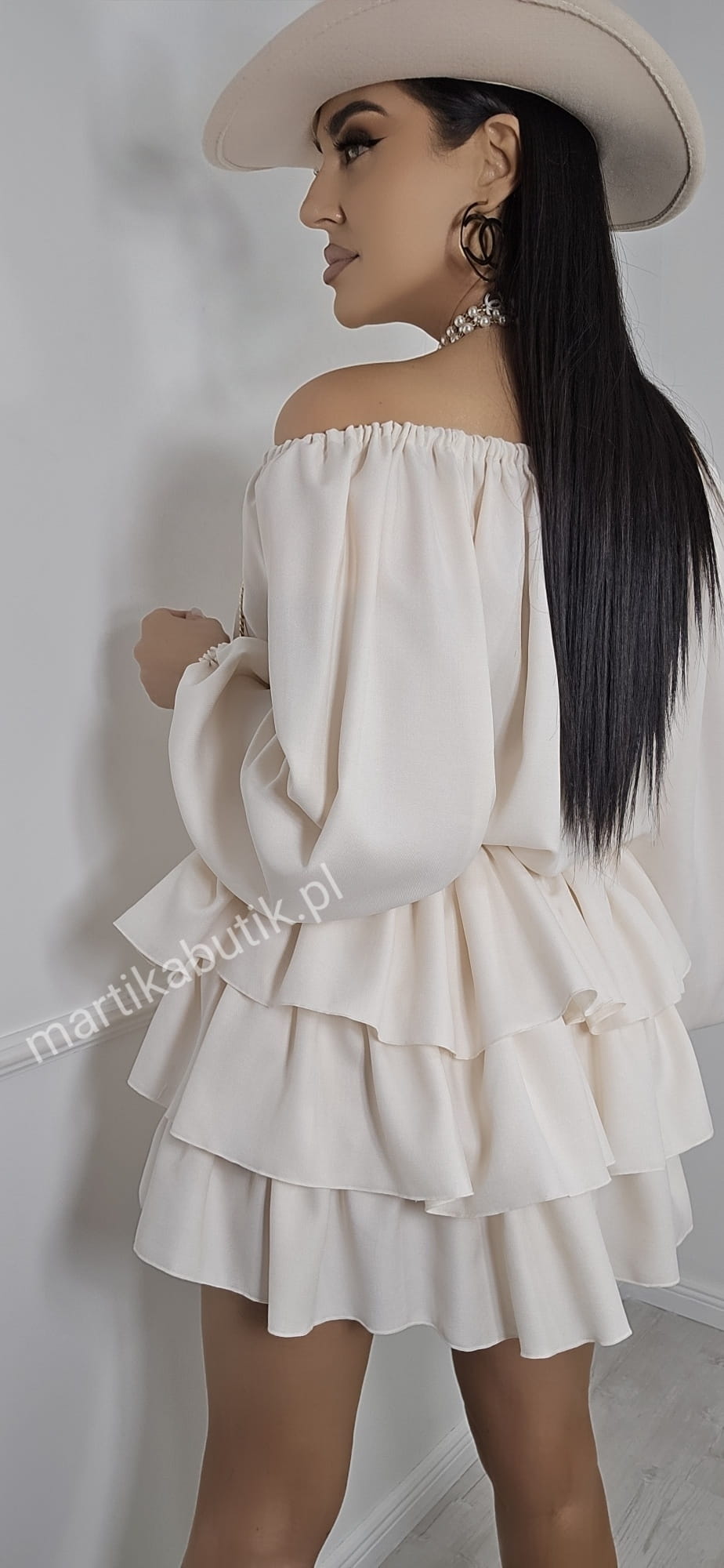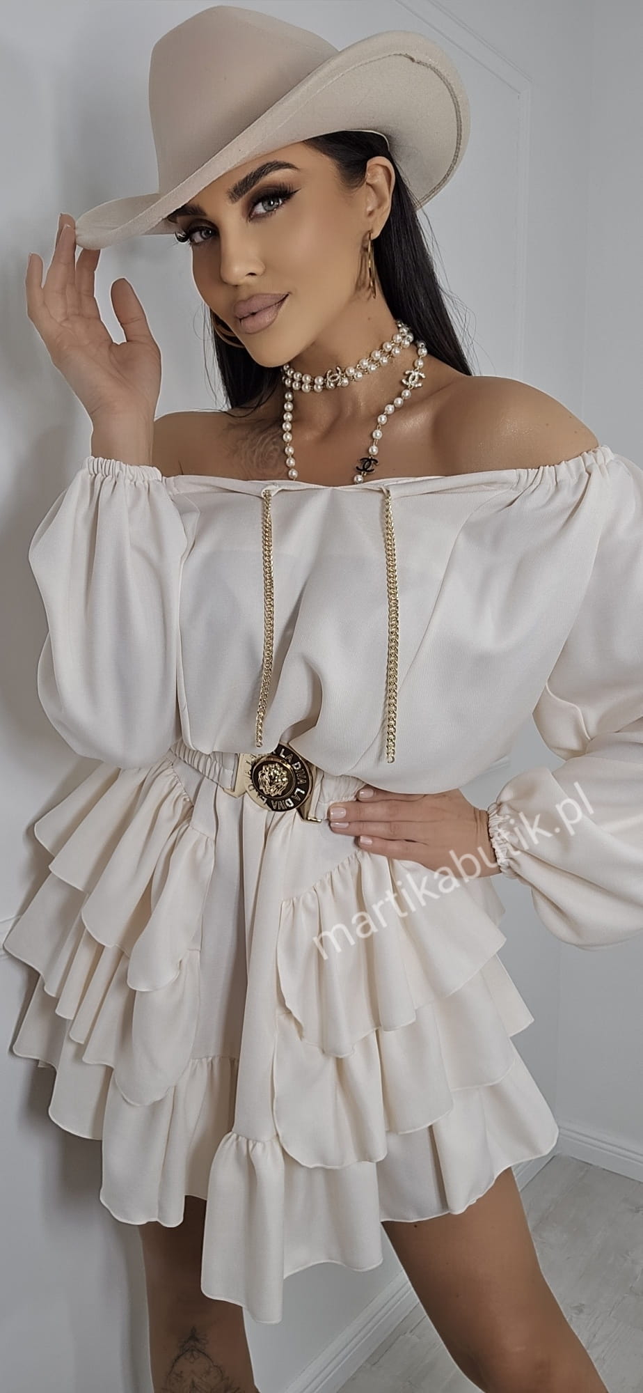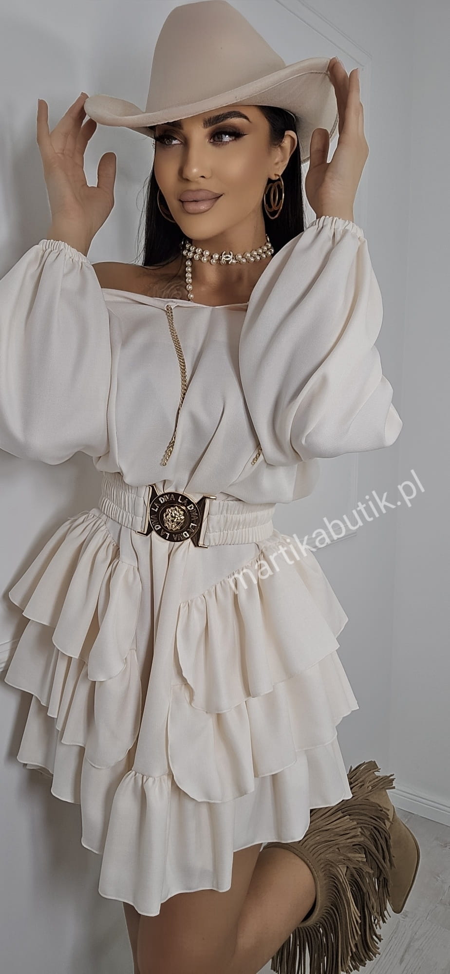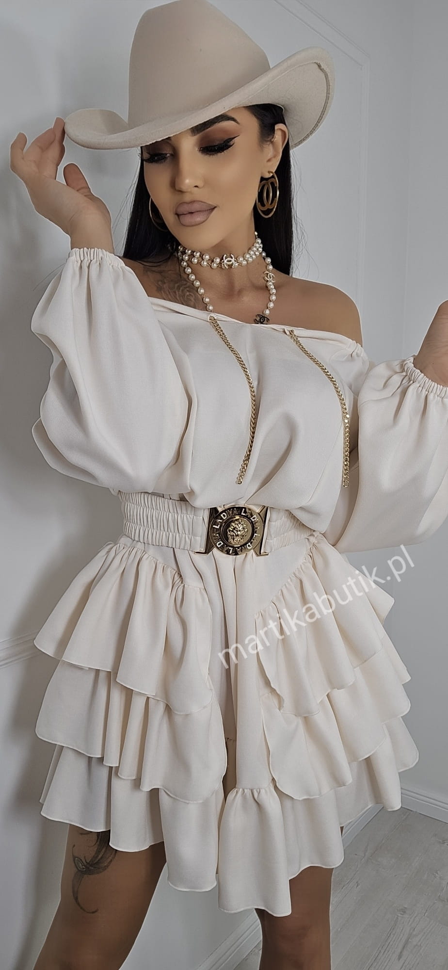 Bogate falbanki, marszczony pasek ze złotą klamrą w komplecie, dzięki któremu sama regulujesz długość sukienki.