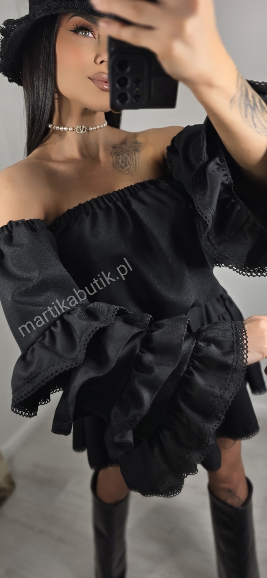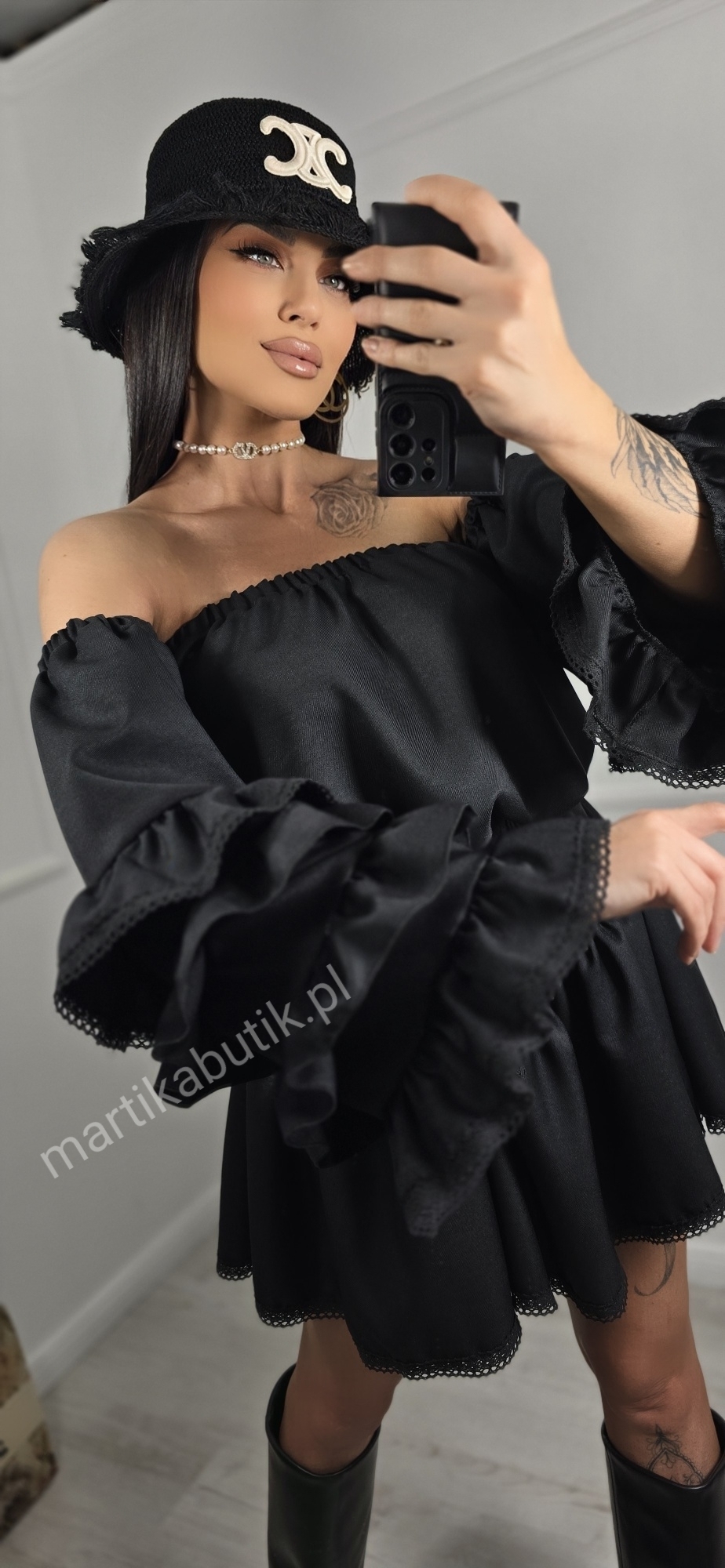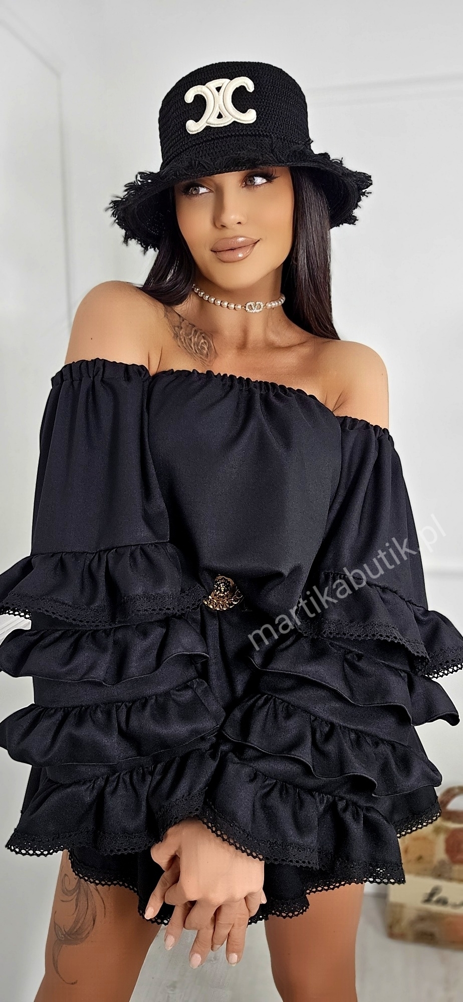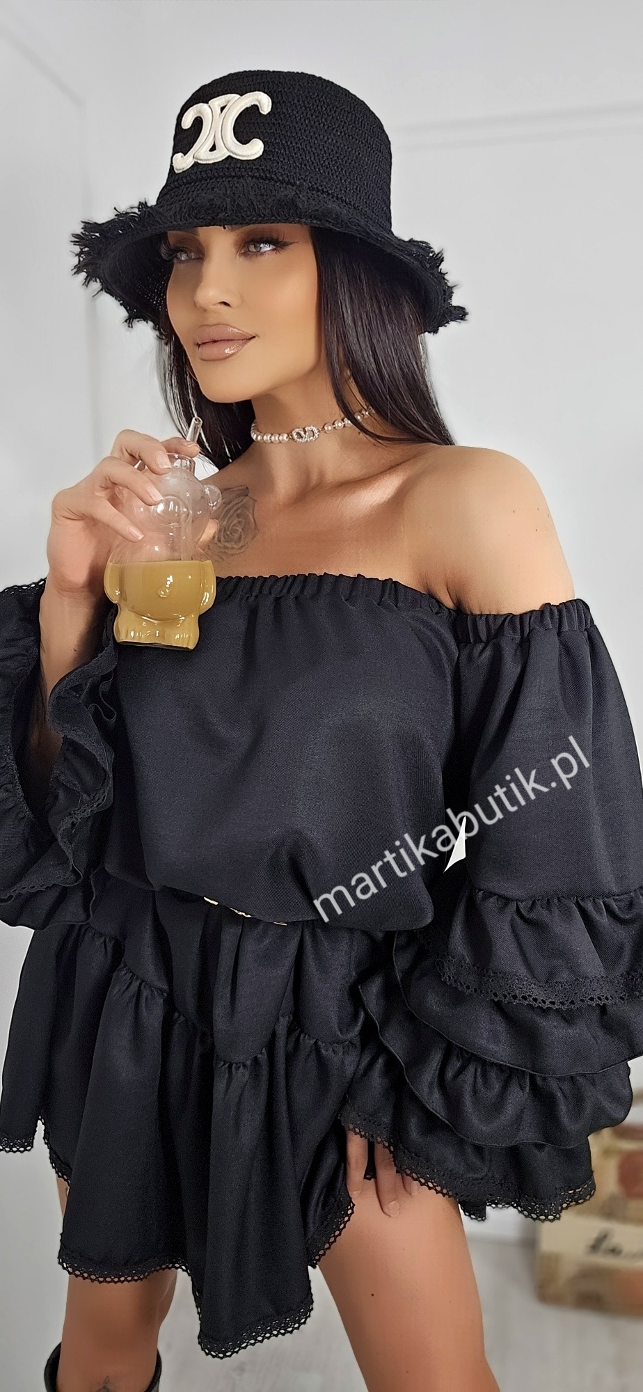Bogate falbanki na rękawach dają niesamowity efekt, marszczony pasek ze złotą klamrą w komplecie, dzięki któremu sama regulujesz długość sukienki.