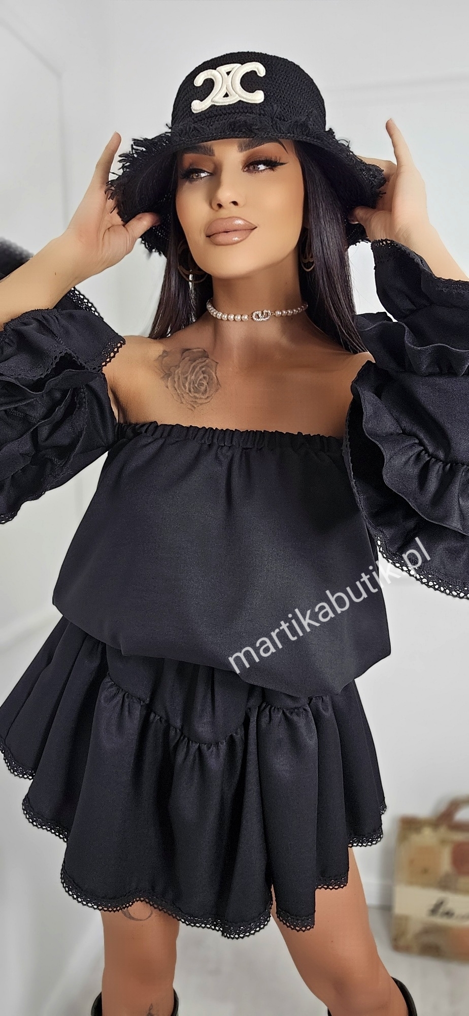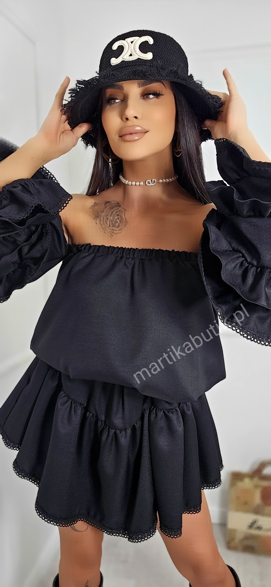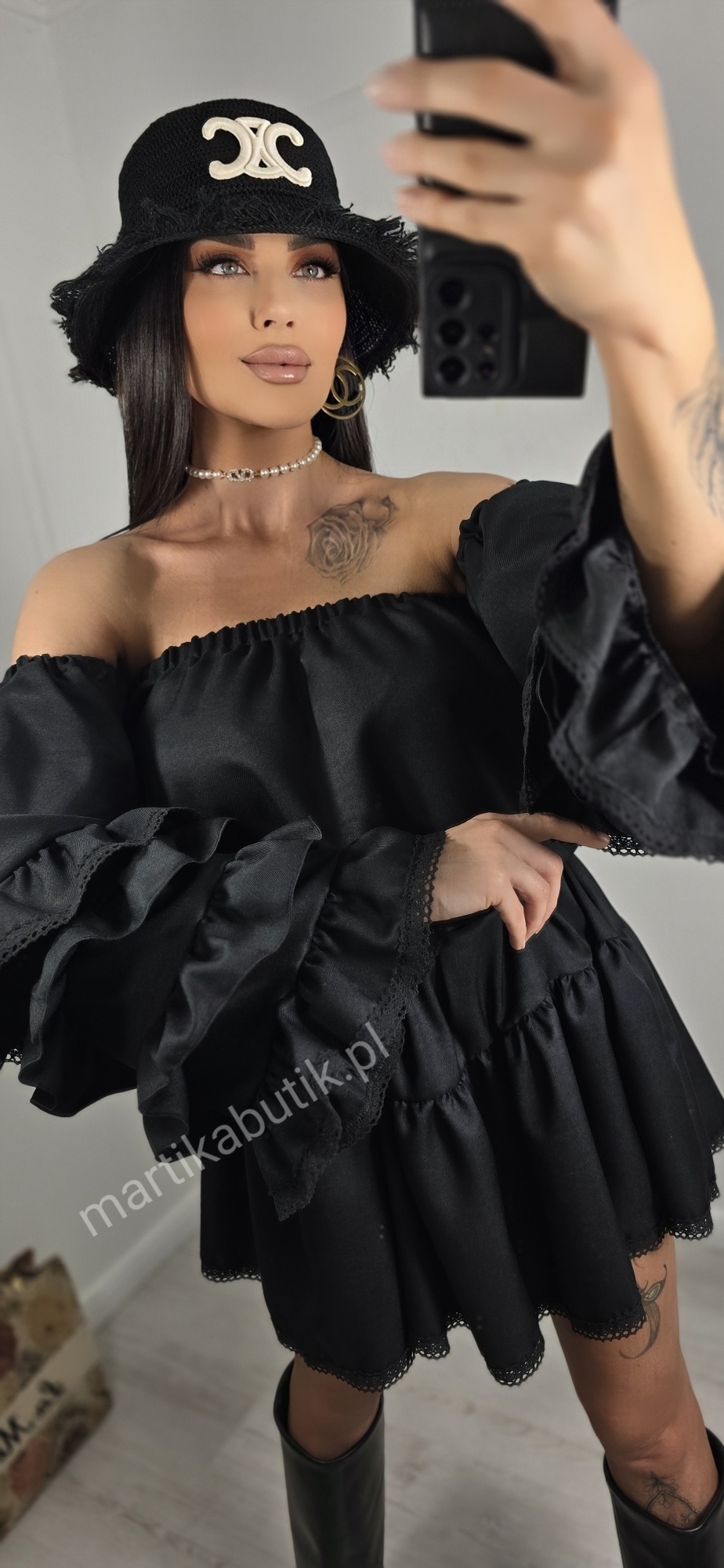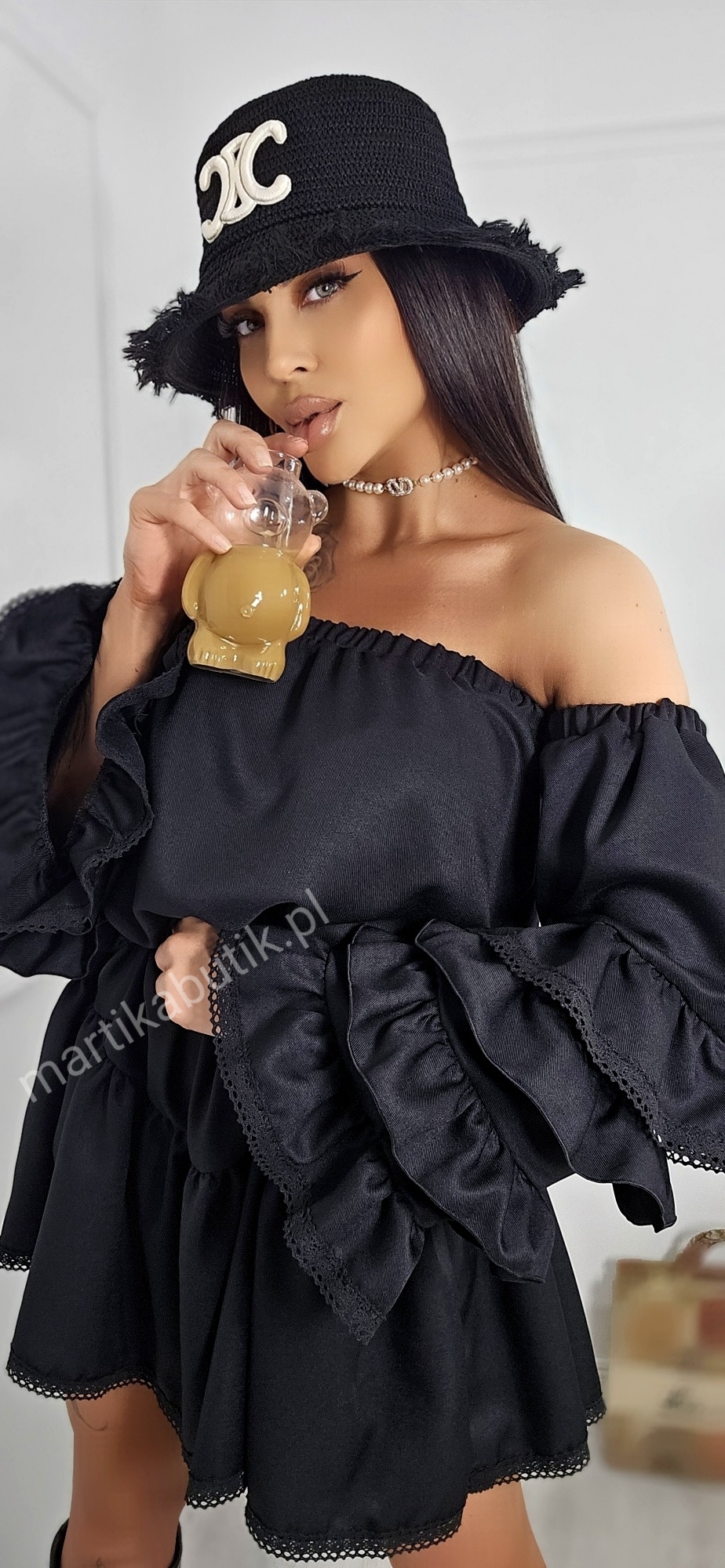 Bogate falbanki na rękawach dają niesamowity efekt, marszczony pasek ze złotą klamrą w komplecie, dzięki któremu sama regulujesz długość sukienki.
