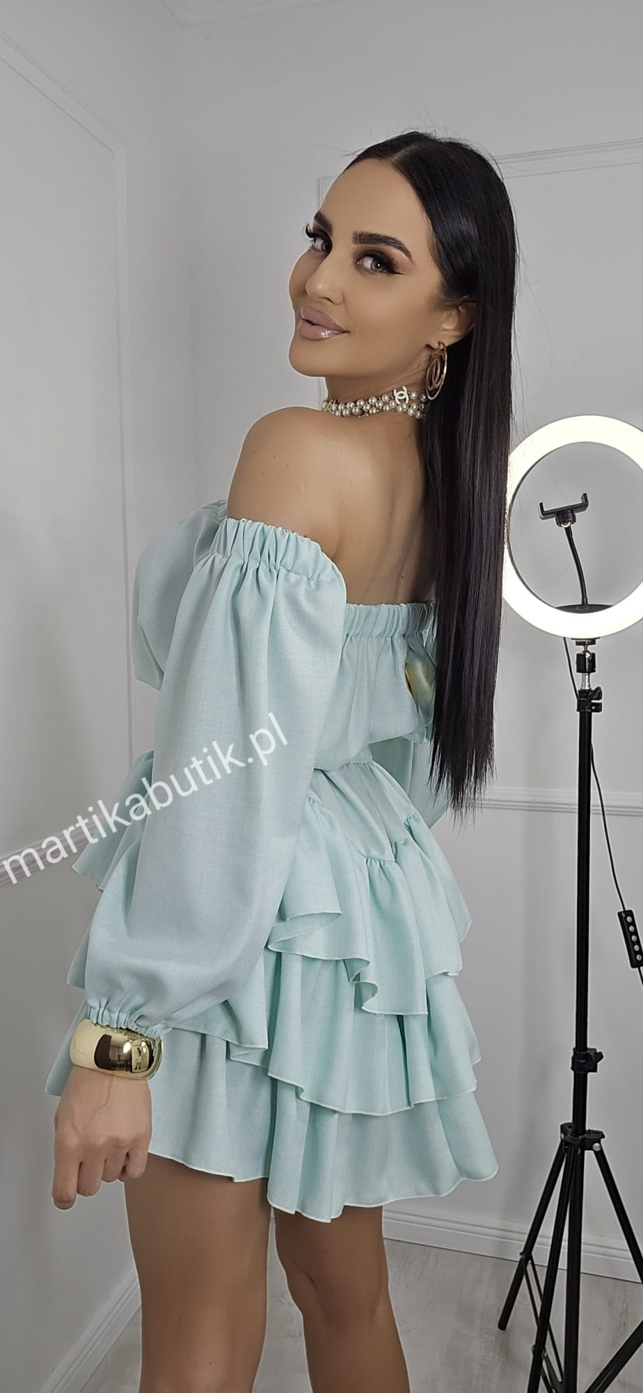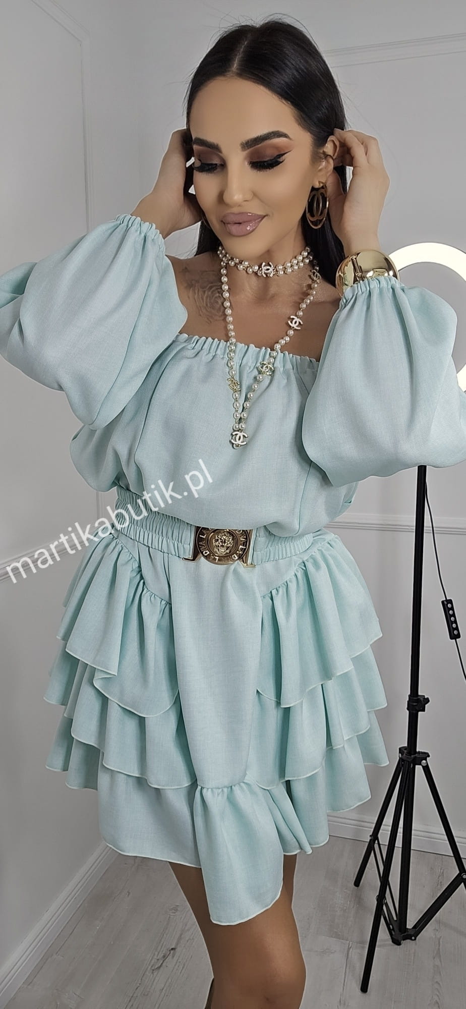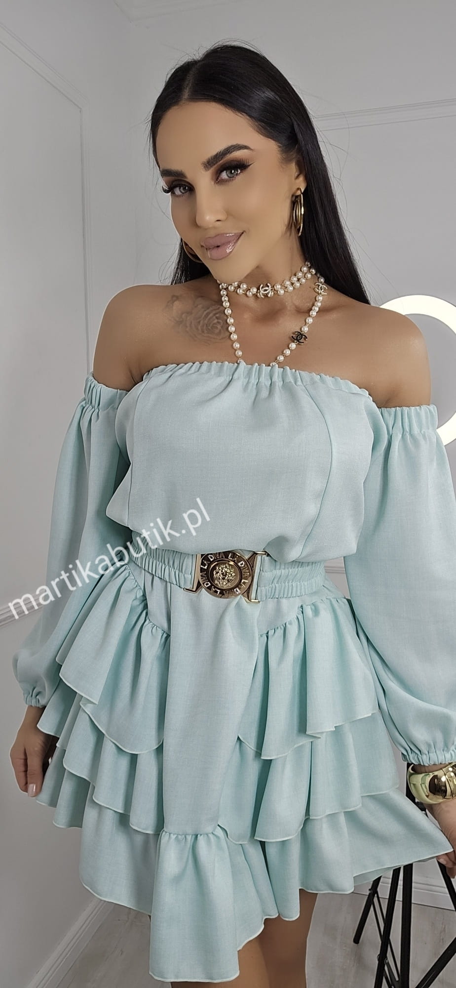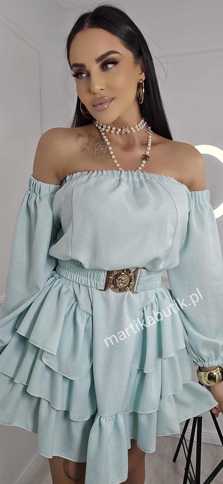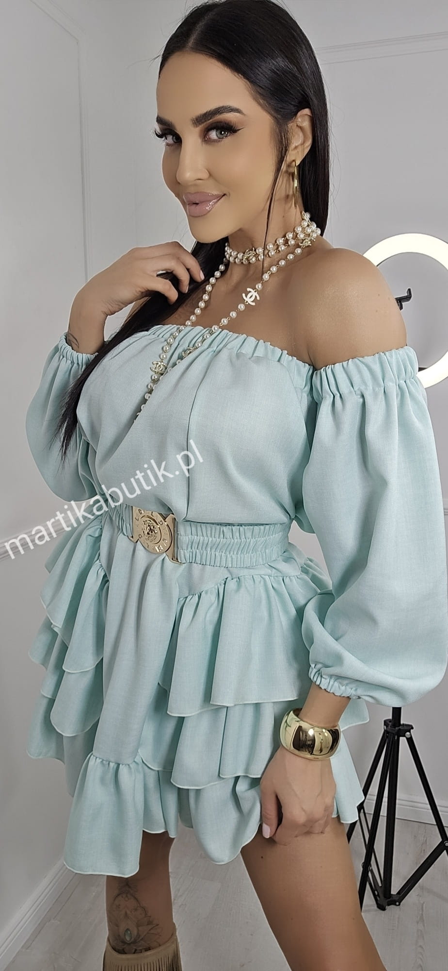 Bogate falbanki, marszczony pasek ze złotą klamrą w komplecie, dzięki któremu sama regulujesz długość sukienki.