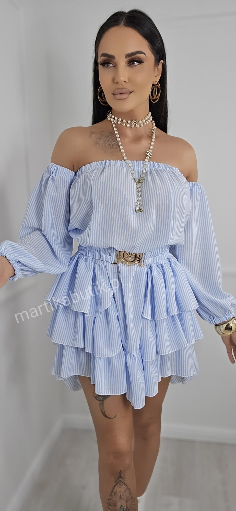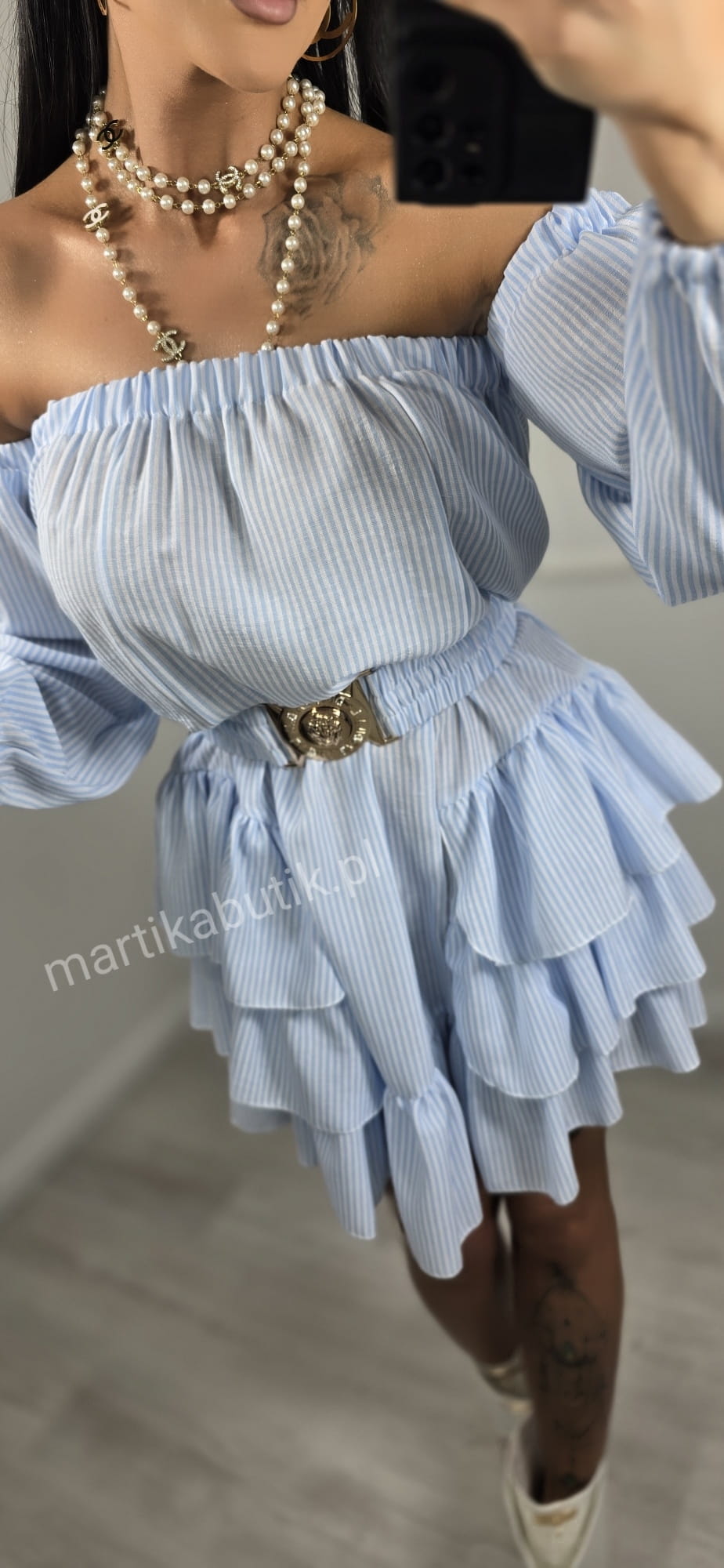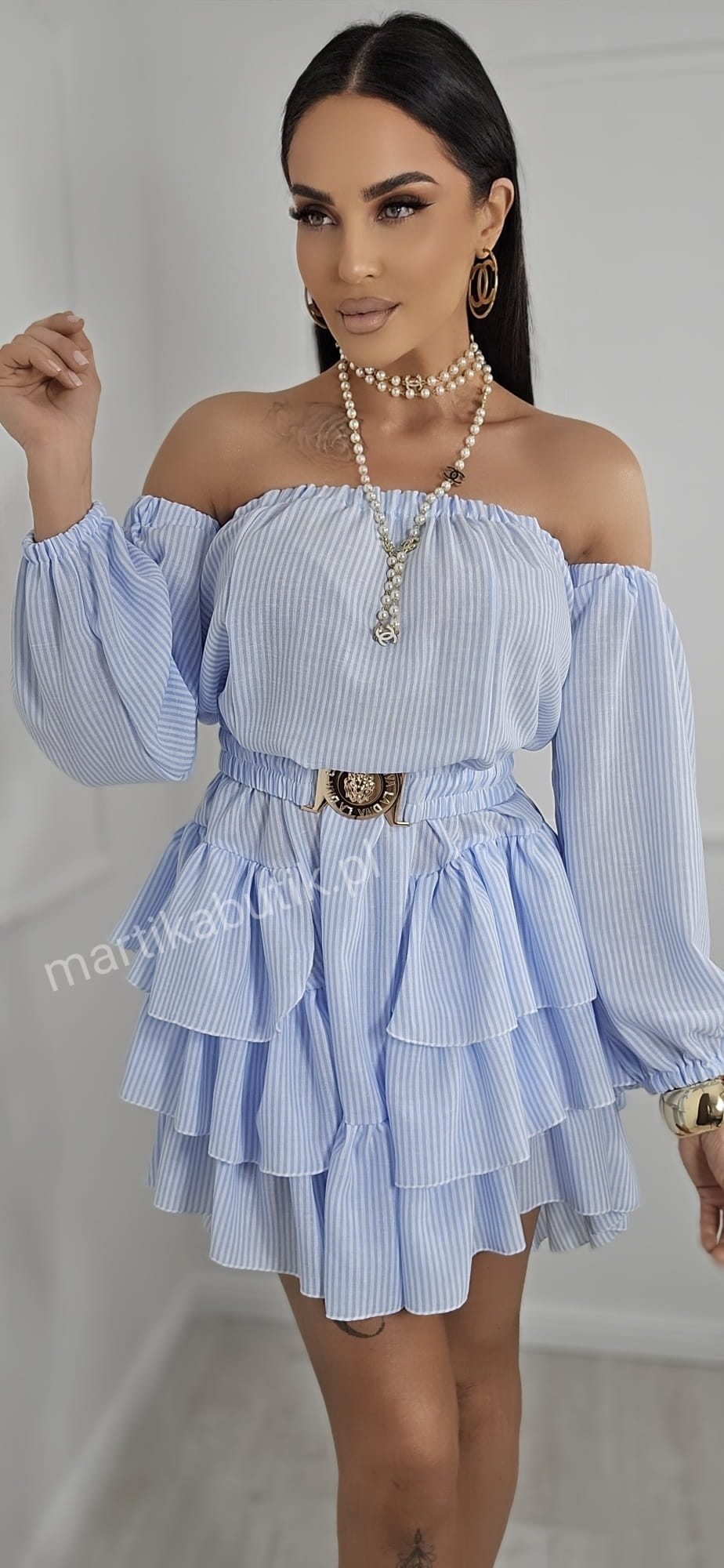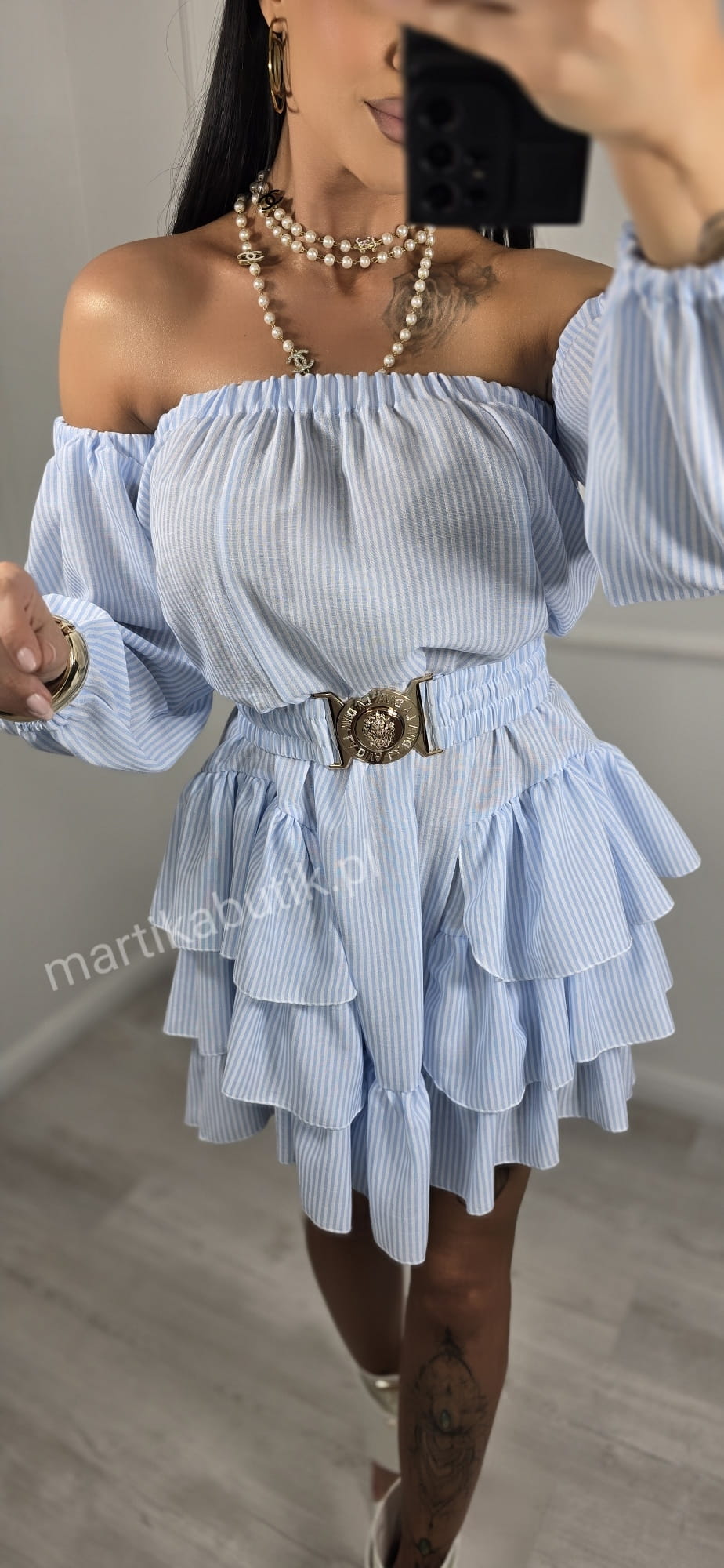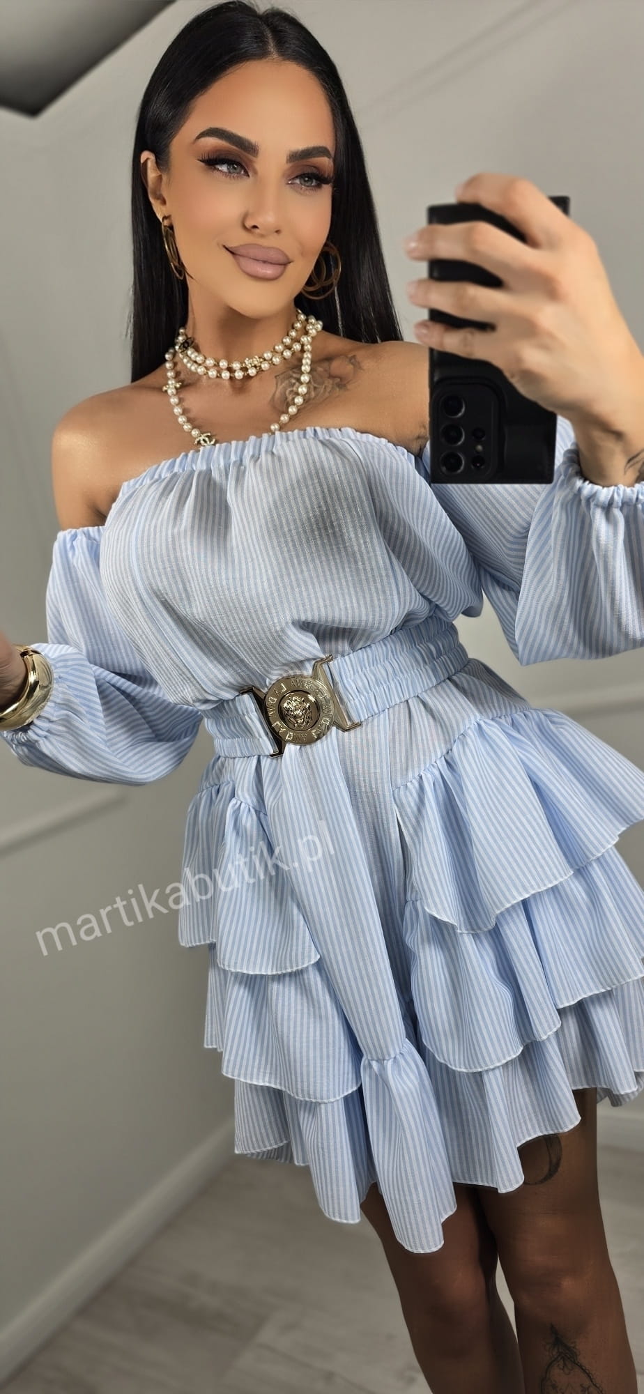 Bogate falbanki, marszczony pasek ze złotą klamrą w komplecie, dzięki któremu sama regulujesz długość sukienki.