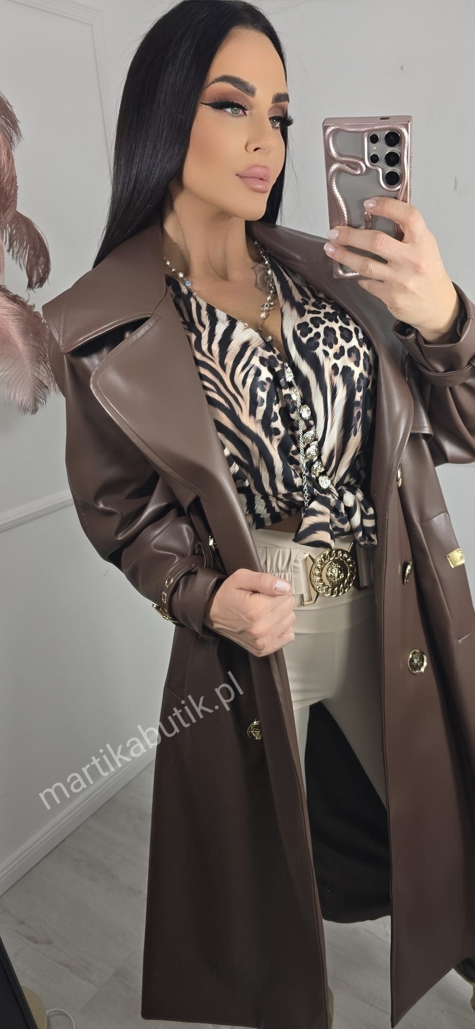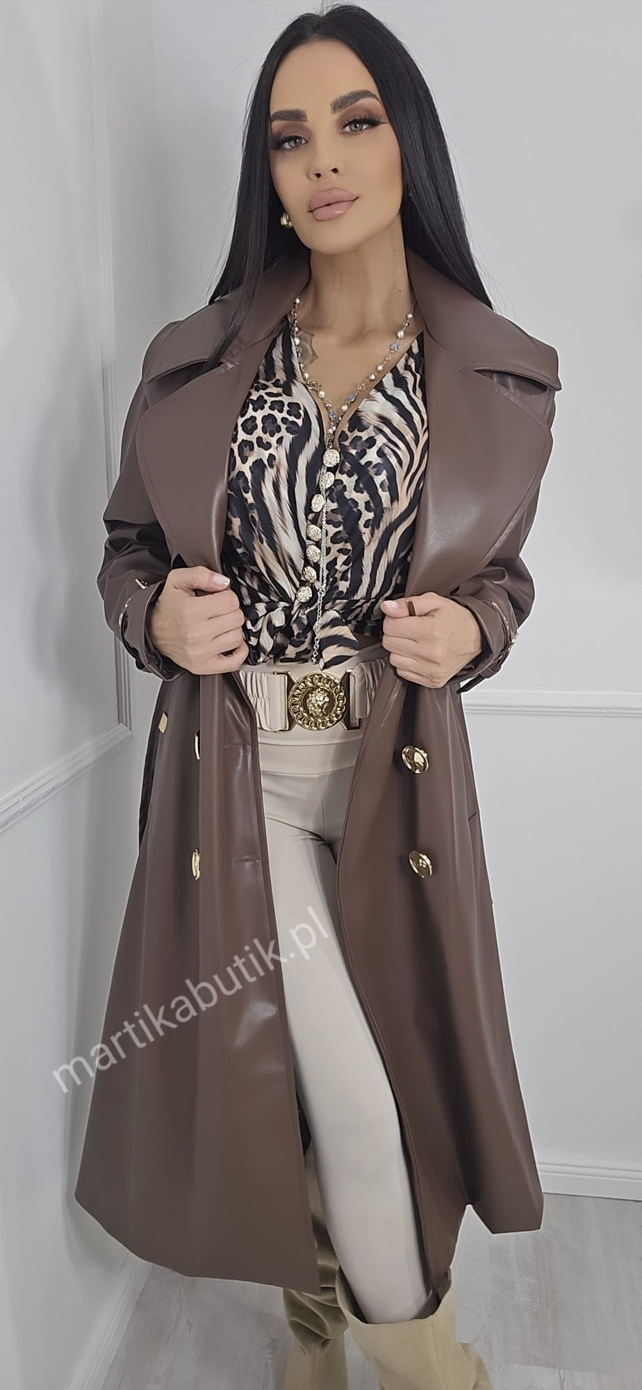 Płaszcz posiada pasek oraz podszewkę a całość zdobią złote dodatki co nadaje mu luksusowego charakteru.