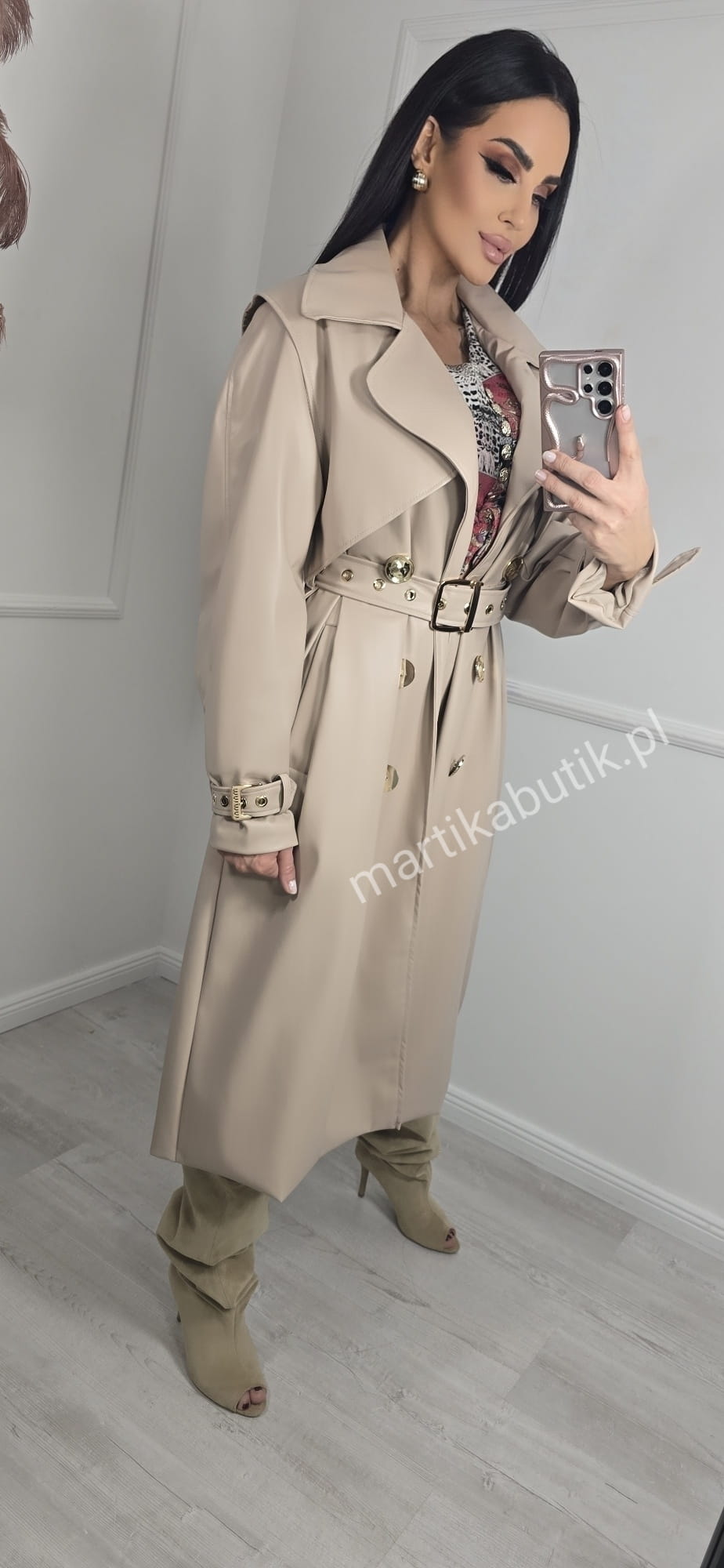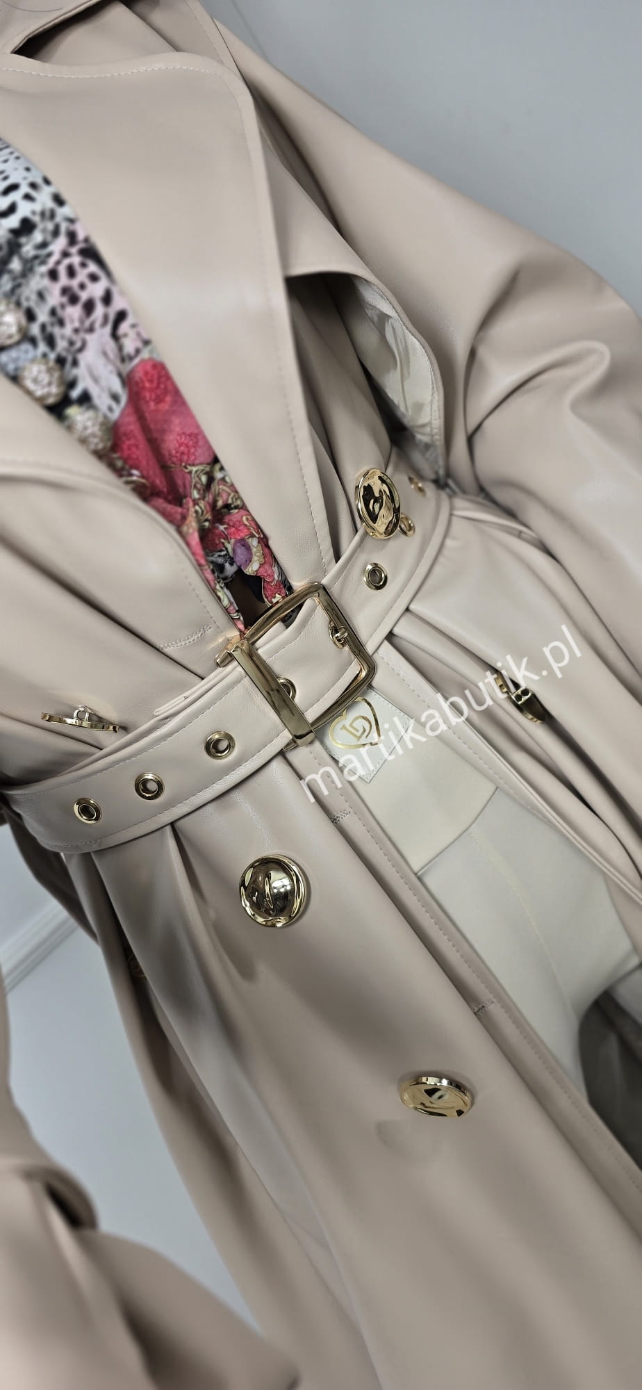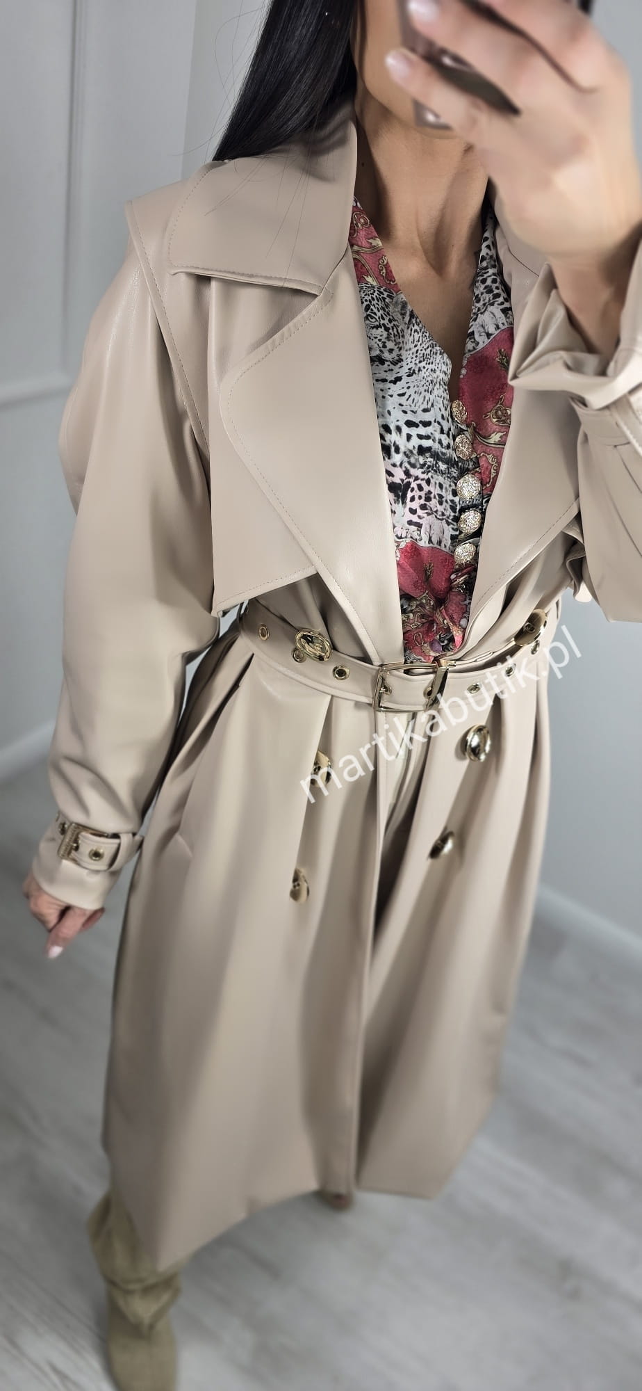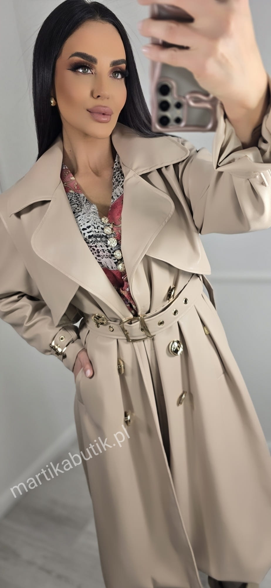 Płaszcz posiada pasek oraz podszewkę a całość zdobią złote dodatki co nadaje mu luksusowego charakteru.
