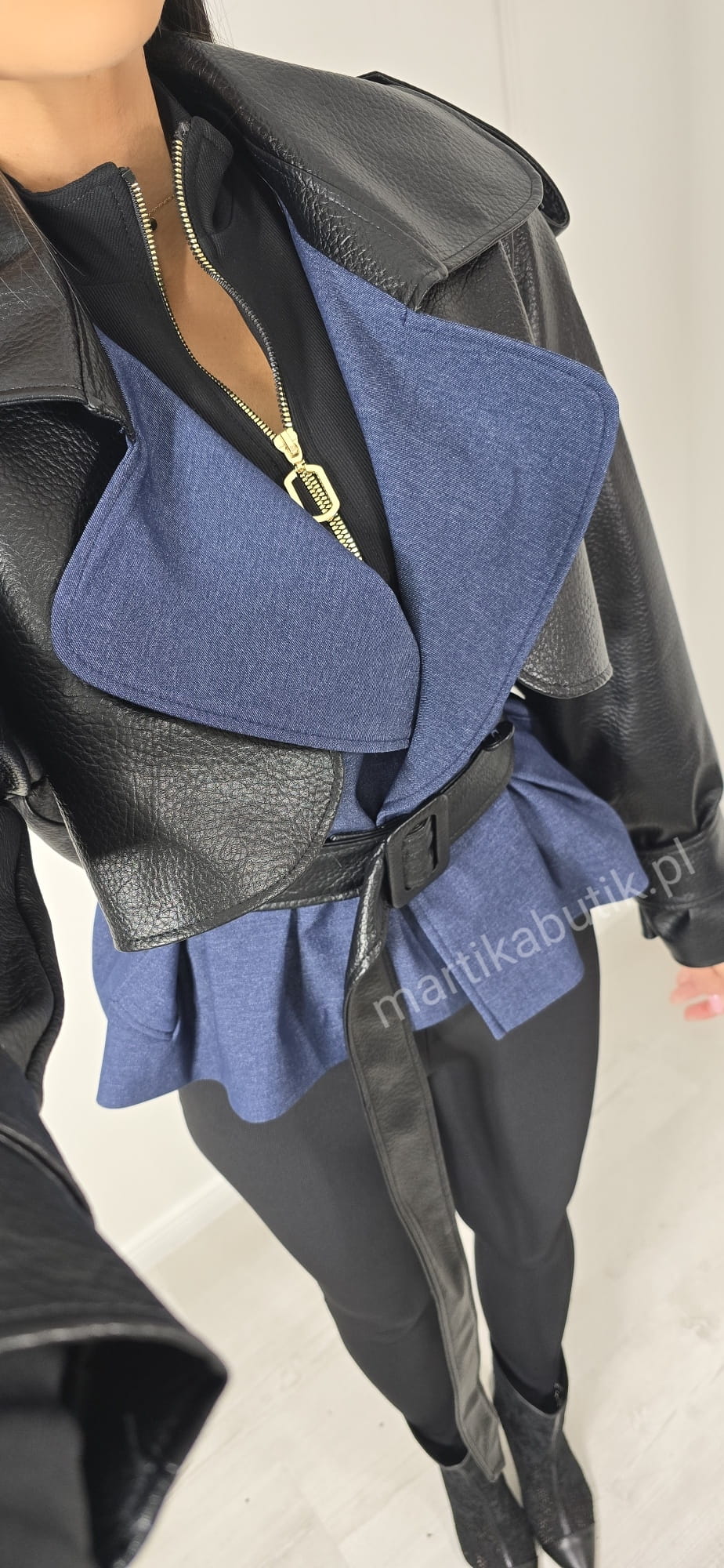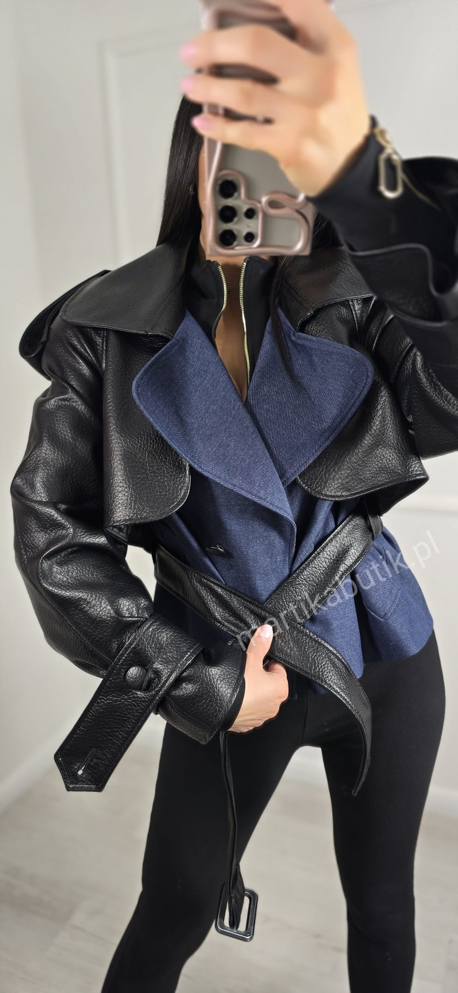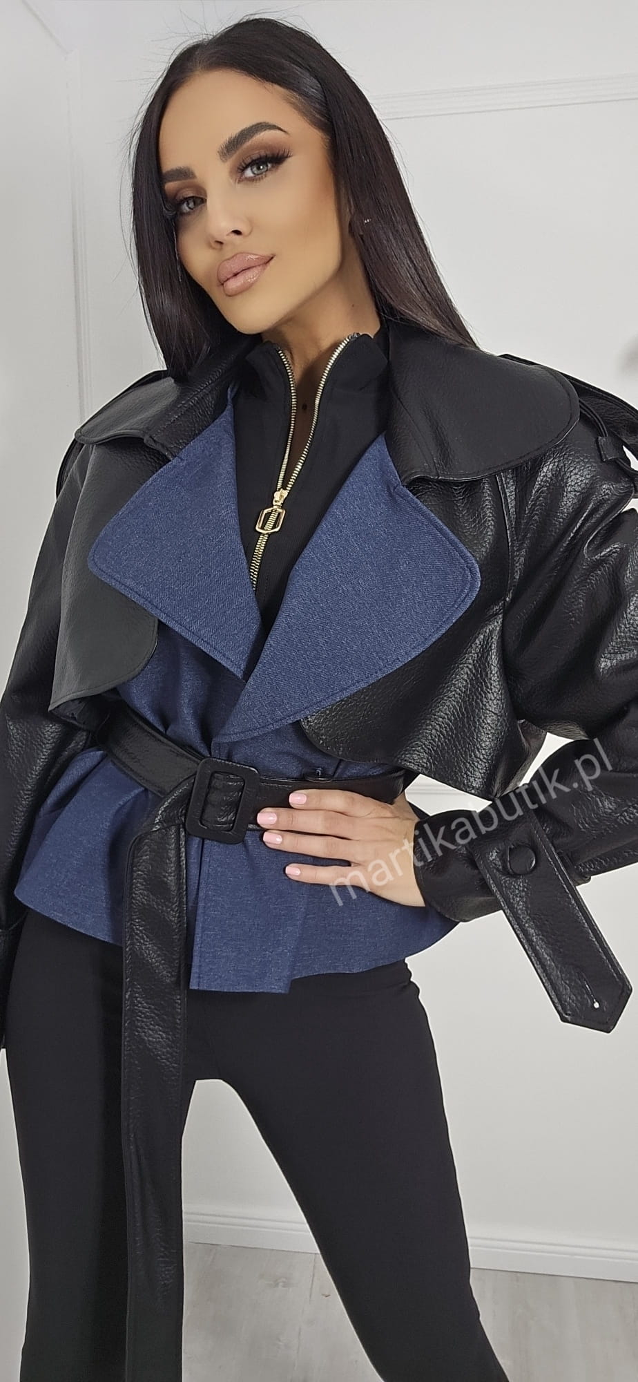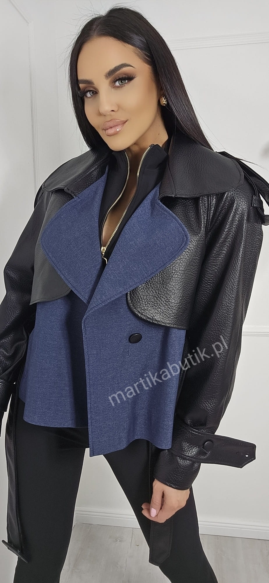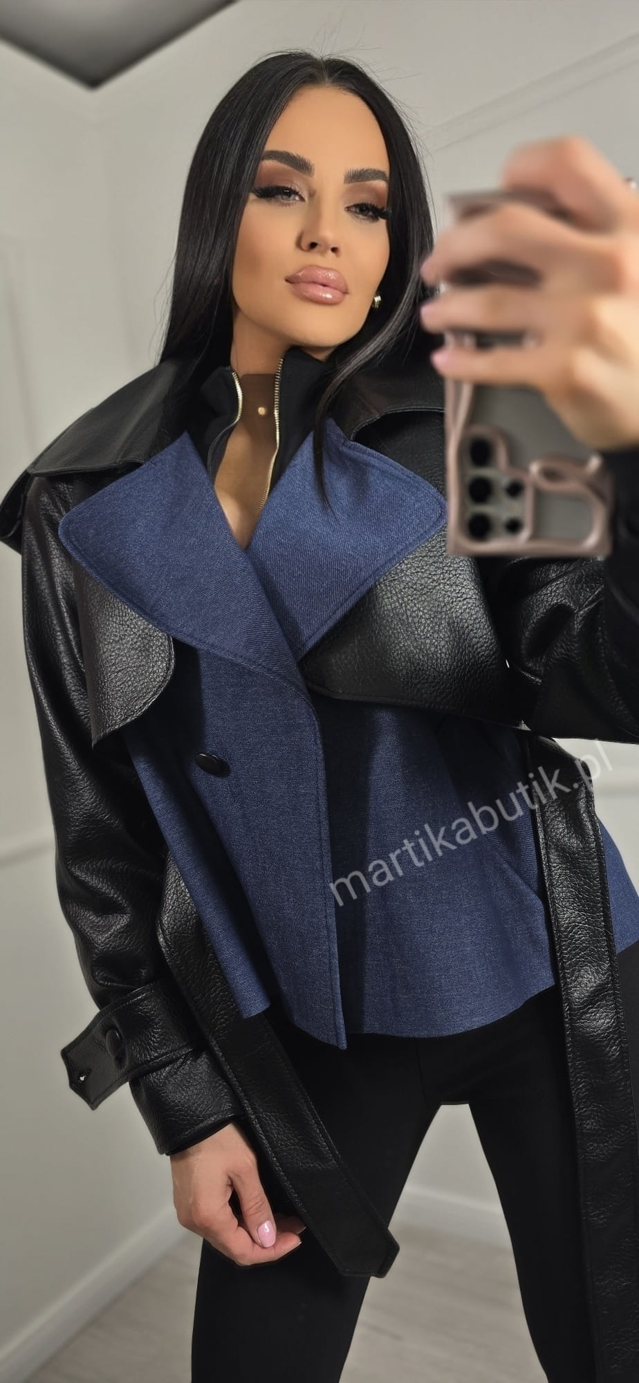 Stylowy płaszcz wykonany z wysokogatunkowej, niesamowicie miękkiej skóry ekologicznej w połączeniu z tkaniną w kolorze ciemnego denimu.
